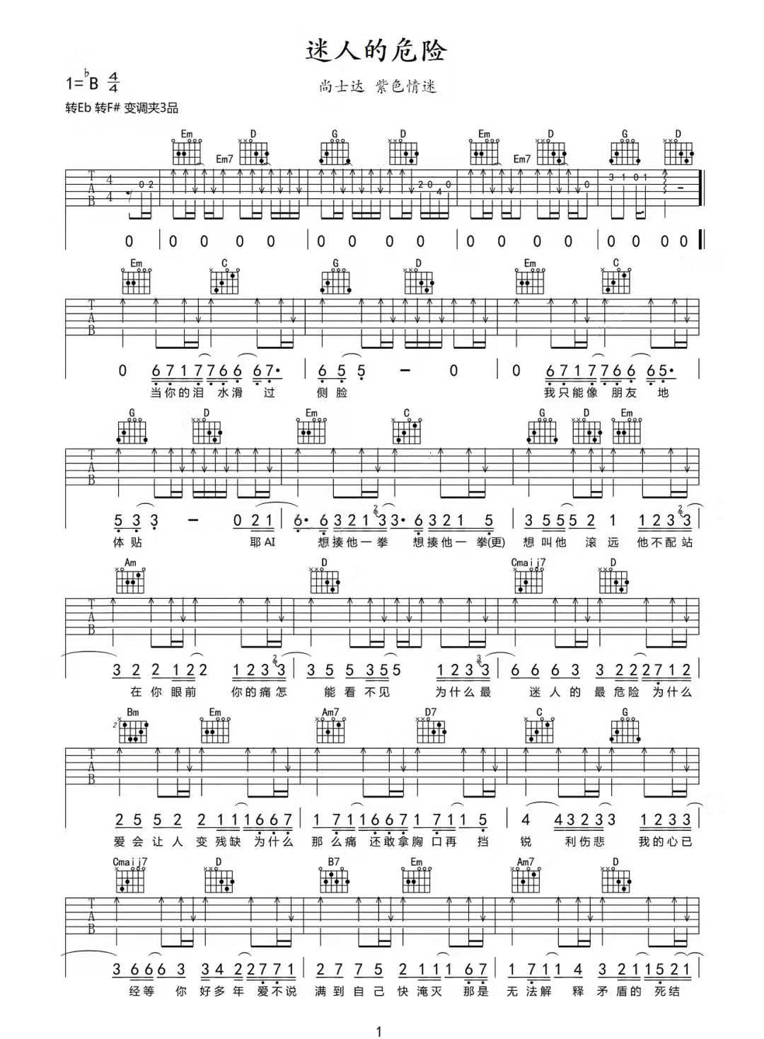 《《迷人的危险》吉他谱_尚士达_G调原版弹唱高清六线谱免费分享,《迷人的危险》是由组合Danceflow演唱的一首歌。歌里刻画了三角恋的关系,有来自第三方的不甘、矛盾心理,也有来自爱情里的犹豫,确实是一首感情很丰富的歌曲。此版本的曲谱来源于网络搜集,版权归原作者所有。歌曲原调为降B调,这里采用G调指法根据尚士达翻唱版本进行编配,演唱时夹变调夹3品回到原调。歌曲后面的部分有个转调,转到采用#F调的和弦,有些难度。