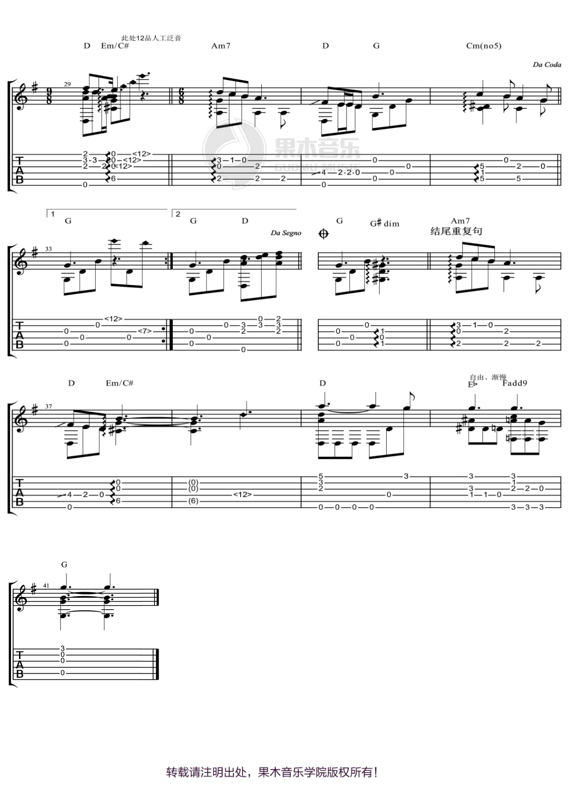 《《我和我的祖国》指弹吉他谱_王菲_独奏高清六线谱免费分享,《我和我的祖国》是由王菲演唱的一首爱国歌曲,这个歌曲也是作为了最近的同名电影《我和我的祖国》中的主题曲,另外这个歌曲原版本为李谷一老师献唱。此次分享的是来自于胡sir吉他教室根据歌曲改编而来的指弹吉他版本,指法较为简单,适合新手练习。