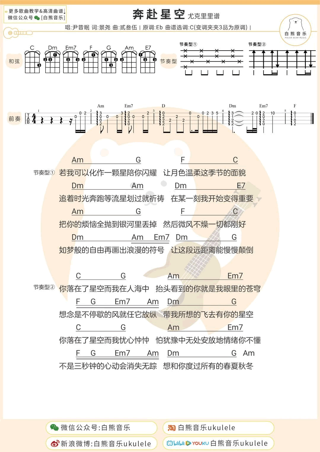 尹昔眠《奔赴星空》尤克里里谱 ukulele图片谱