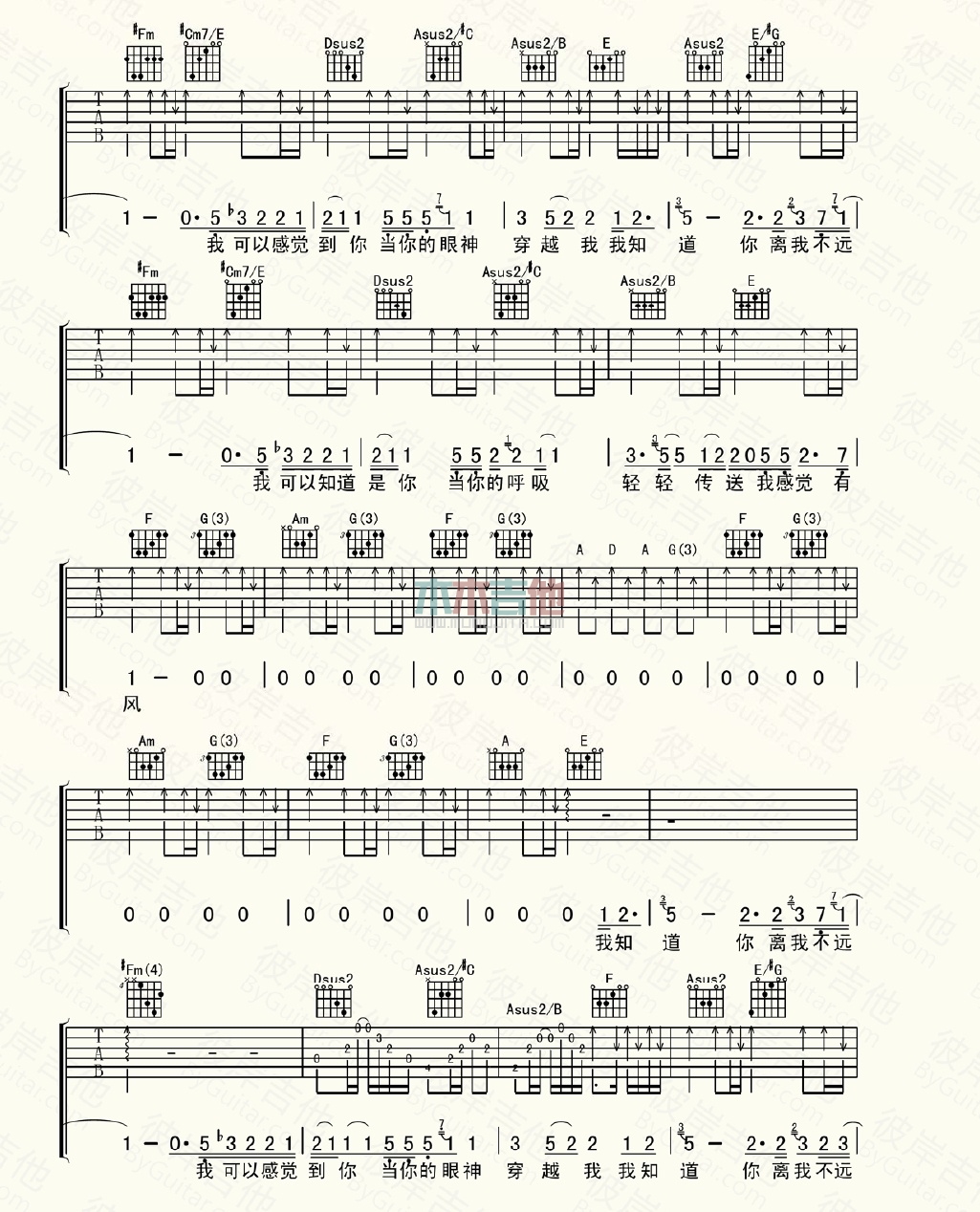 《我知道你离我不远》吉他谱,由陈楚生演唱的,流行弹唱,我知道你离我不远六线谱,C调制法,一共4张高清弹唱图片谱,采用'4/4拍子,拍速为60-80,单吉他,弹奏难度为:简单,吉他部落 jita2012.com整理上传。我知道你离我不远 吉他简谱我知道你离我不远 歌词 作曲 : 陈楚生 作词 : 李格弟我知道你离我不远演唱:陈楚生你是否曾经像我一样安静地坐在黑暗里看到一千个盲目的
