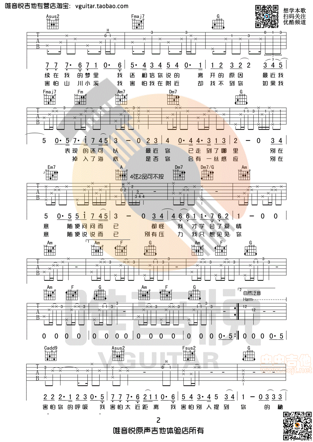 我害怕吉他谱,简单我害原版指弹曲谱,薛之谦高清流行弹唱C调原版唯音悦制谱六线乐谱