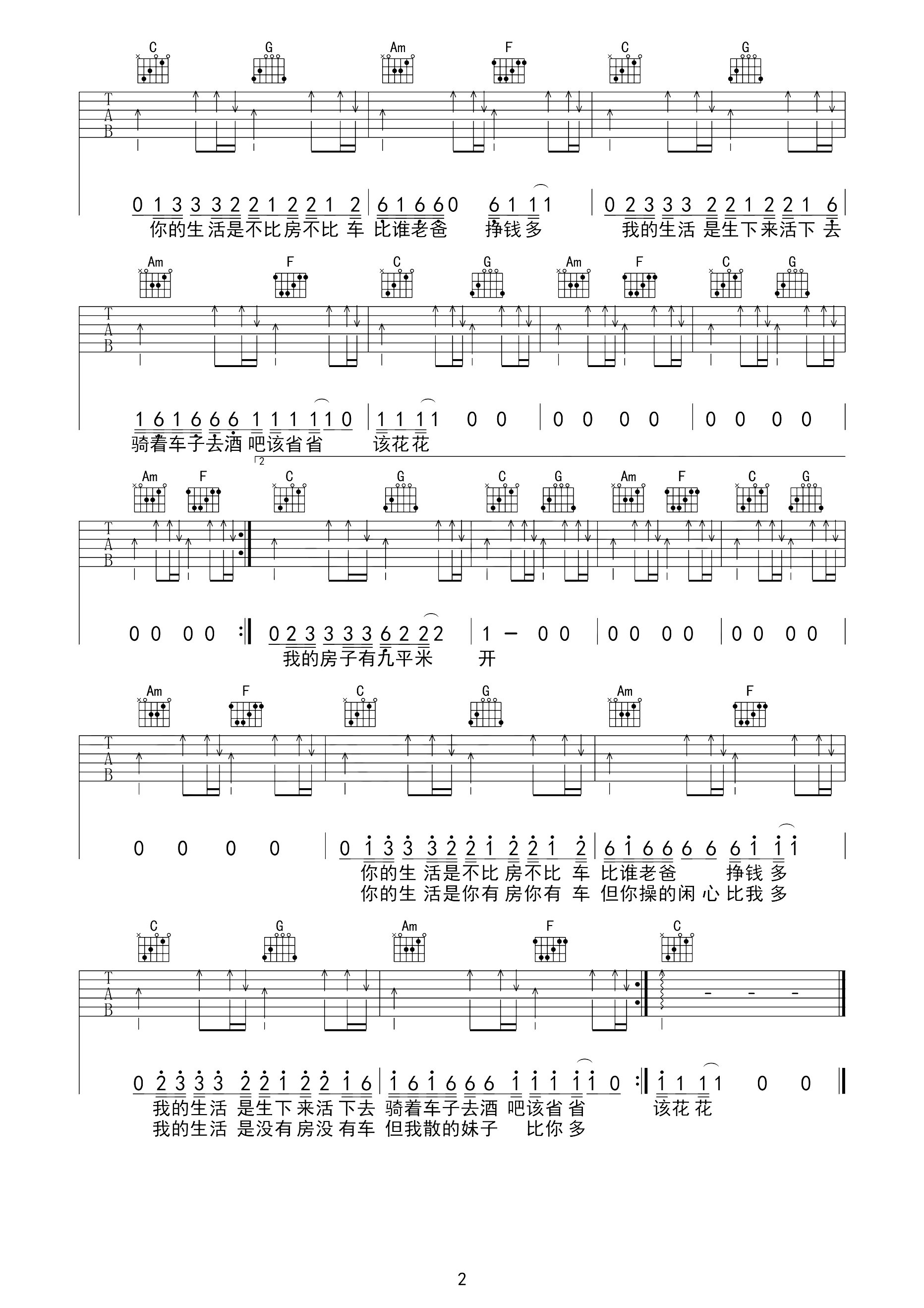 生下来活下去吉他谱本曲谱是选用了D调指法,变调夹夹二品C调指法弹唱。歌词叙事般的铺展开,轻描淡写着不同生活环境下,不同的生活方式和态度。其实歌里描绘的就是赤裸裸的现实,人不怕努力吃苦,怕的是不公平和得不到赏识,不及时调整心态,很难让自己快乐起来。未卜唱出了屌丝的理想心态,你在意的是出人头地互相攀比,我珍惜的是唱歌喝酒自由恣意,你有你的世界,我有我的天地。