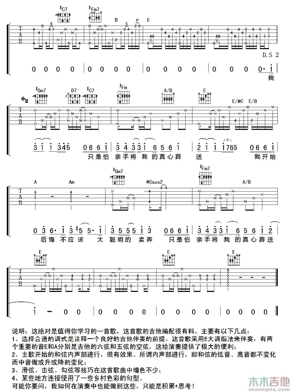 我不会喜欢你吉他谱,原版歌曲,简单E调弹唱教学,六线谱指弹简谱4张图