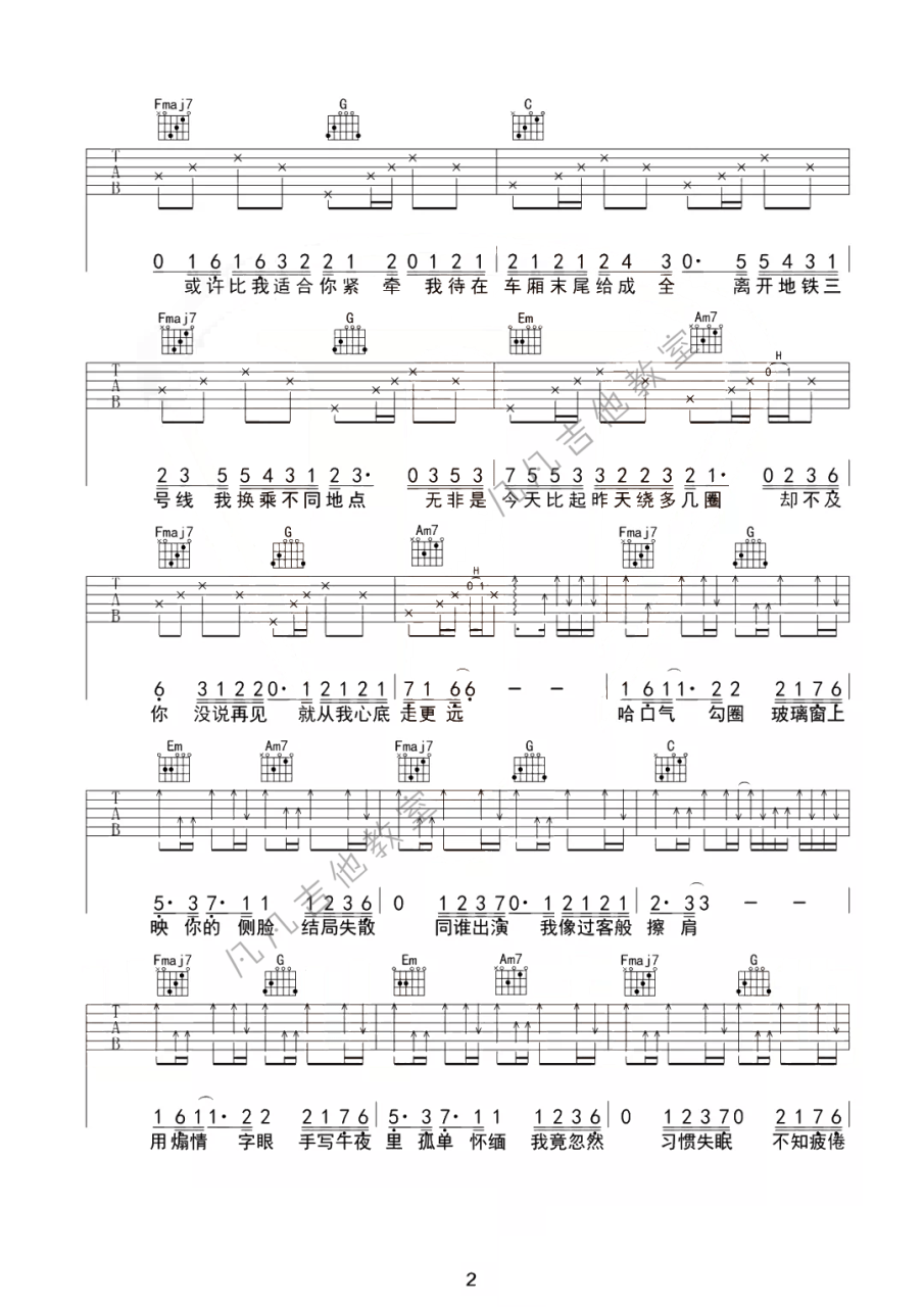 如果您想要学习刘大壮演唱的《三号线》的吉他谱,那么您来对地方了。这首弹唱简谱这首歌的节奏非常紧凑,让人跟着一起舞动。这个完整版弹唱简谱是由凡凡吉他教室制谱编配的,适合新手入门学习C调教学吉他谱。这是一首非常好听的歌曲,下面高清图片谱由极网吉它谱更新分享。如果您是吉他爱好者请关注我们的网站!