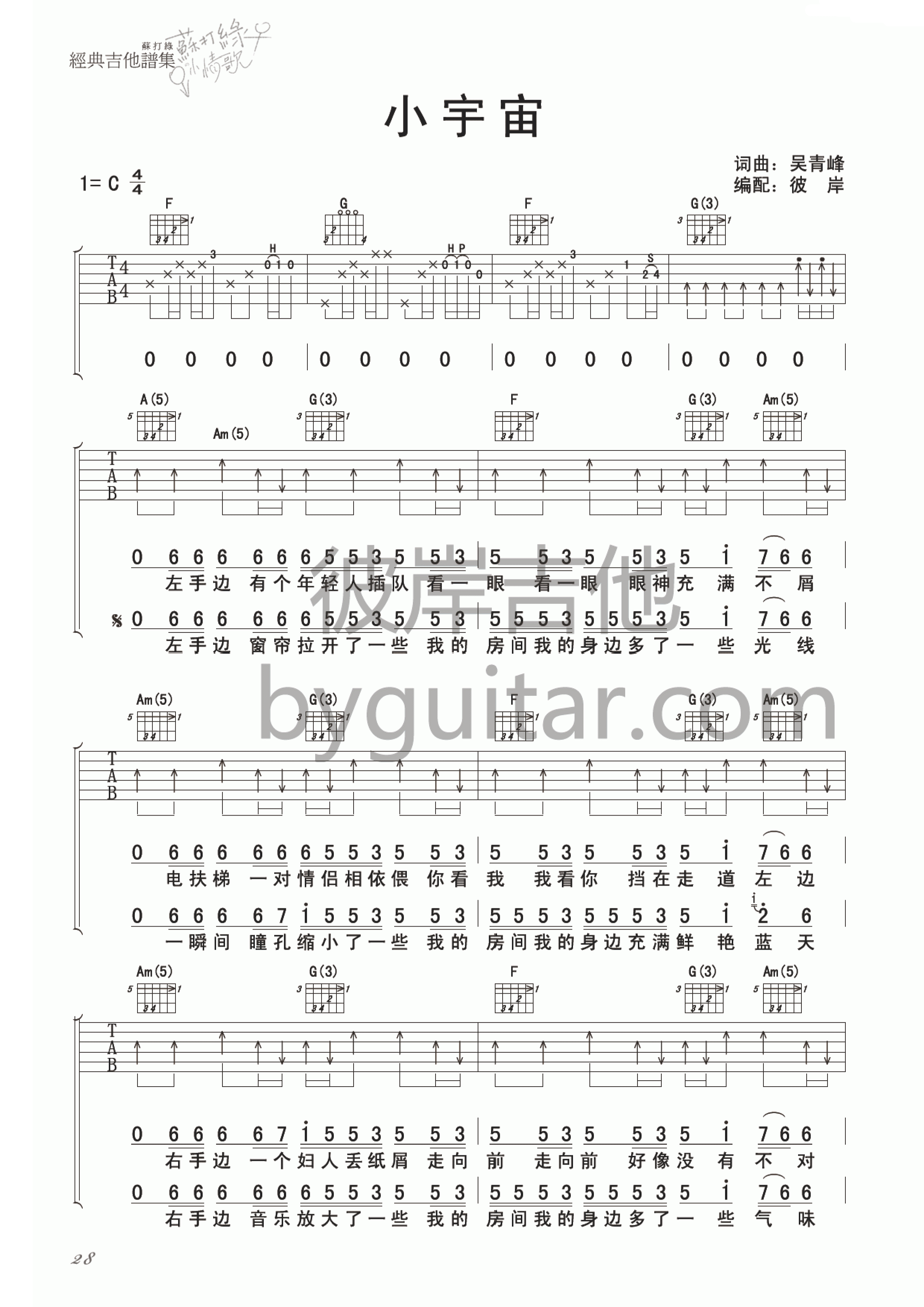 小宇宙吉他谱,它是苏打绿演唱的歌曲,由彼岸吉他编配制谱,是一首经典歌曲编配的 C调指弹编配的曲谱,