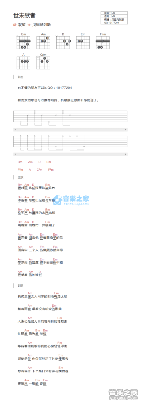 如果您想要学习双笙演唱的《世末歌者》的吉他谱,那么您来对地方了。这首弹唱简谱歌曲的旋律抒情优美,令人流连忘返。这个完整版弹唱简谱是由音乐之家制谱编配的,适合新手入门学习G调教学吉他谱。这是一首非常好听的歌曲,下面高清图片谱由极网吉它谱更新分享。如果您是吉他爱好者请关注我们的网站!