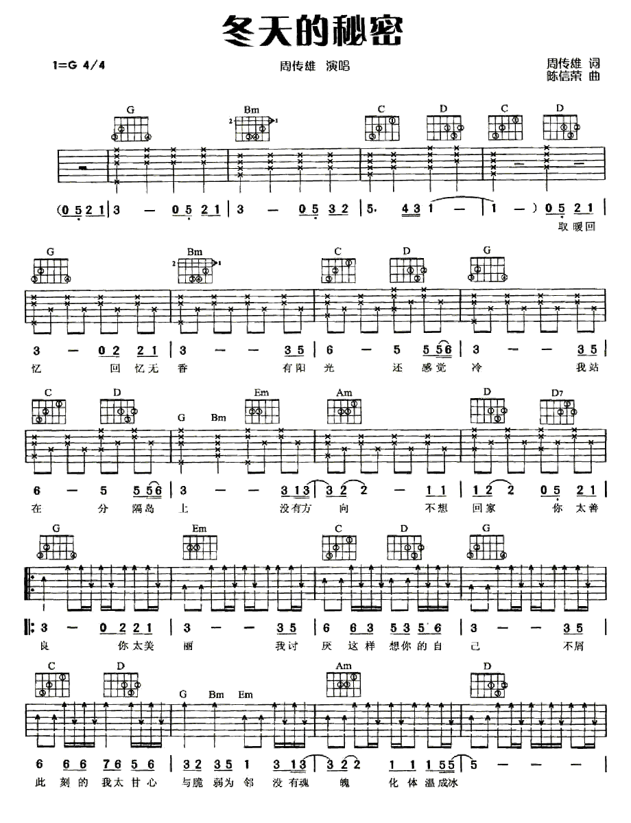 以上就是4/4节拍 G调版的冬天的秘密弹唱简谱,如果正是您所寻找的六线高清图片谱,希望能收藏本站,这里会完全免费且源源不断更新各种周传雄简单入门曲谱