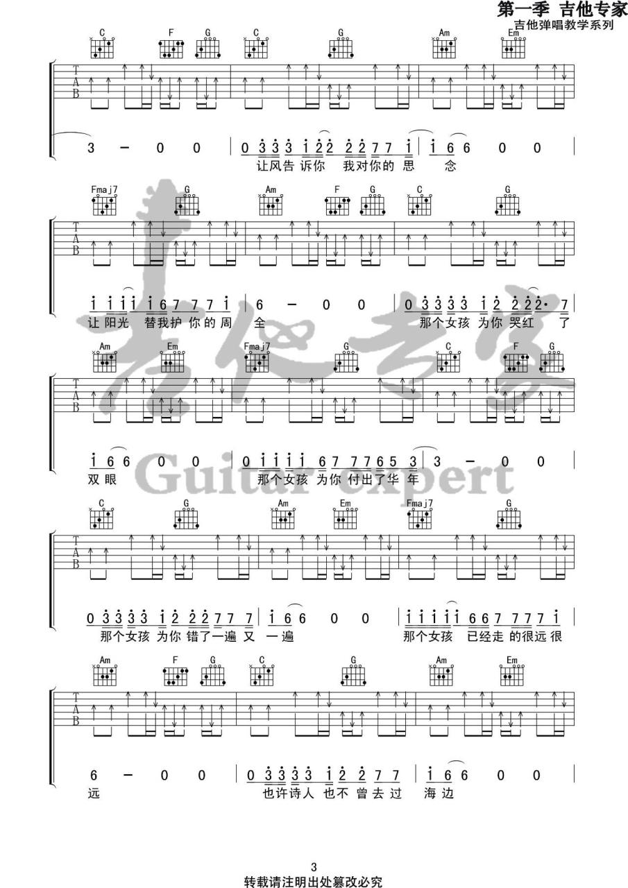 那个女孩吉他谱,张泽熙歌曲,C调指弹简谱,新手弹唱高清版