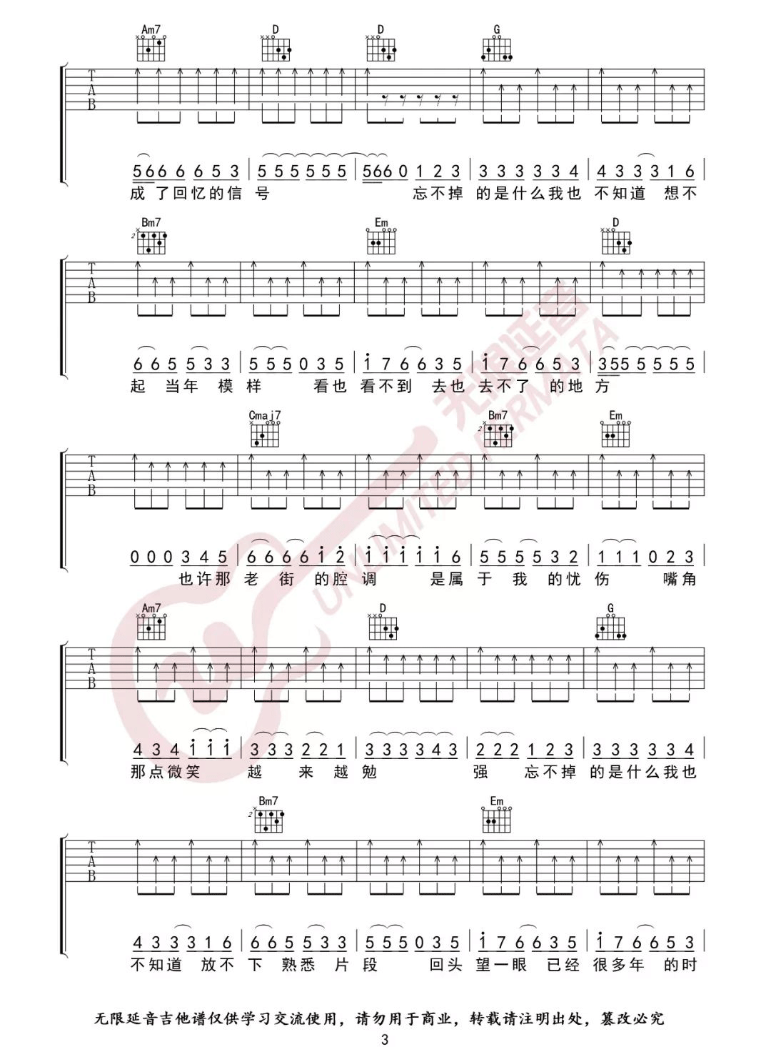 《老街吉他谱_李荣浩_《老街》G调原版弹唱高清六线谱免费分享,《老街》是由李荣浩作词作曲并演唱的一首歌,这个歌曲以平缓感人的曲调、深入人心的歌词以及李荣浩感性的声音唱出了对记忆中的“老街”的回忆,同时也感慨了时光易逝的道理。此版本的曲谱来源于无限延音扒谱制谱,歌曲原调为降G调,这里采用G调指法根据原版进行编配,演唱时降半音调弦。这个歌曲是6/8拍的节奏,全部采用分解和弦的形式进行编配,整体难度不大,比较容易练习。