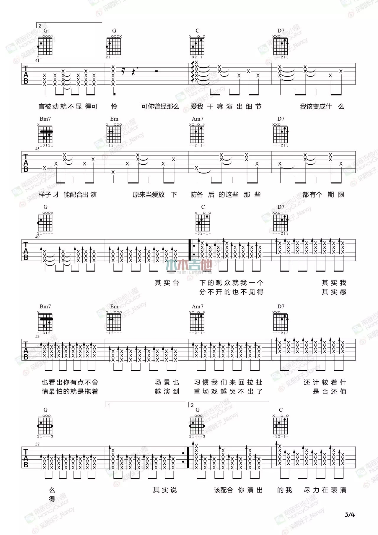《演员》吉他谱,由薛之谦演唱的,流行弹唱Nancy,演员六线谱,C调制法,一共4张高清弹唱图片谱,采用'4/4拍子,拍速为60-80,单吉他,弹奏难度为:极简,吉他部落 jita2012.com整理上传。演员 吉他简谱演员 歌词 作曲 : 薛之谦 作词 : 薛之谦简单点说话的方式简单点递进的情绪请省略你又不是个演员别设计那些情节没意见我只想看看你怎么圆你难过的太表面 像没天赋的演员观众