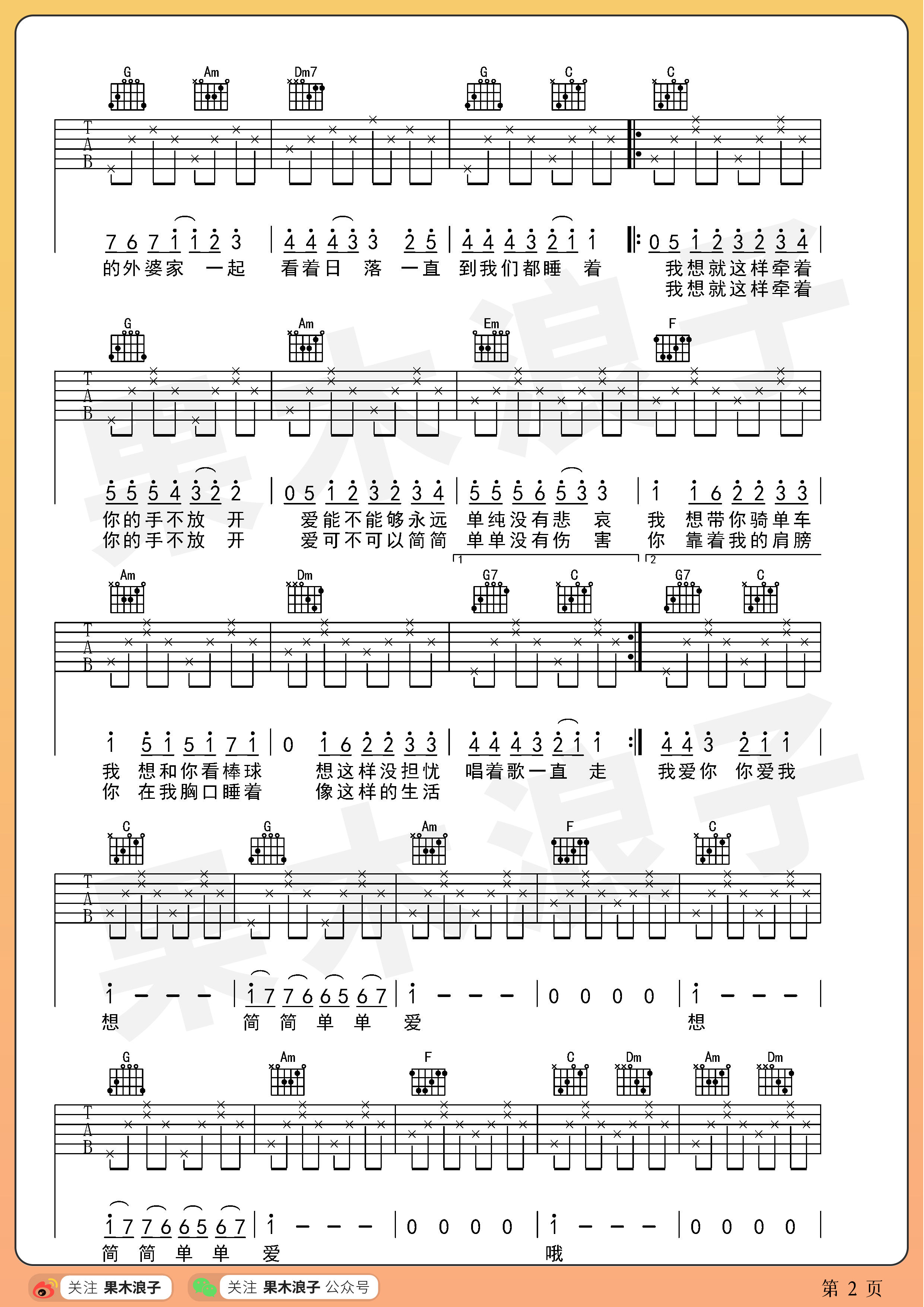简单爱吉他谱,它是周杰伦演唱的原版歌曲它的歌词非常打动人心,让人难以忘怀.,由果木浪子制谱,是一首经典简单的吉他谱,适合新手学习和弦指弹的C调编配曲谱,弹唱时可弹唱时变调夹夹第五品,,原调F调本次教学采用C调,是非常好听的弹唱曲谱,下面完整版高清六线谱由吉它谱大全为大家更新分享。有喜欢吉它的朋友欢迎关注!