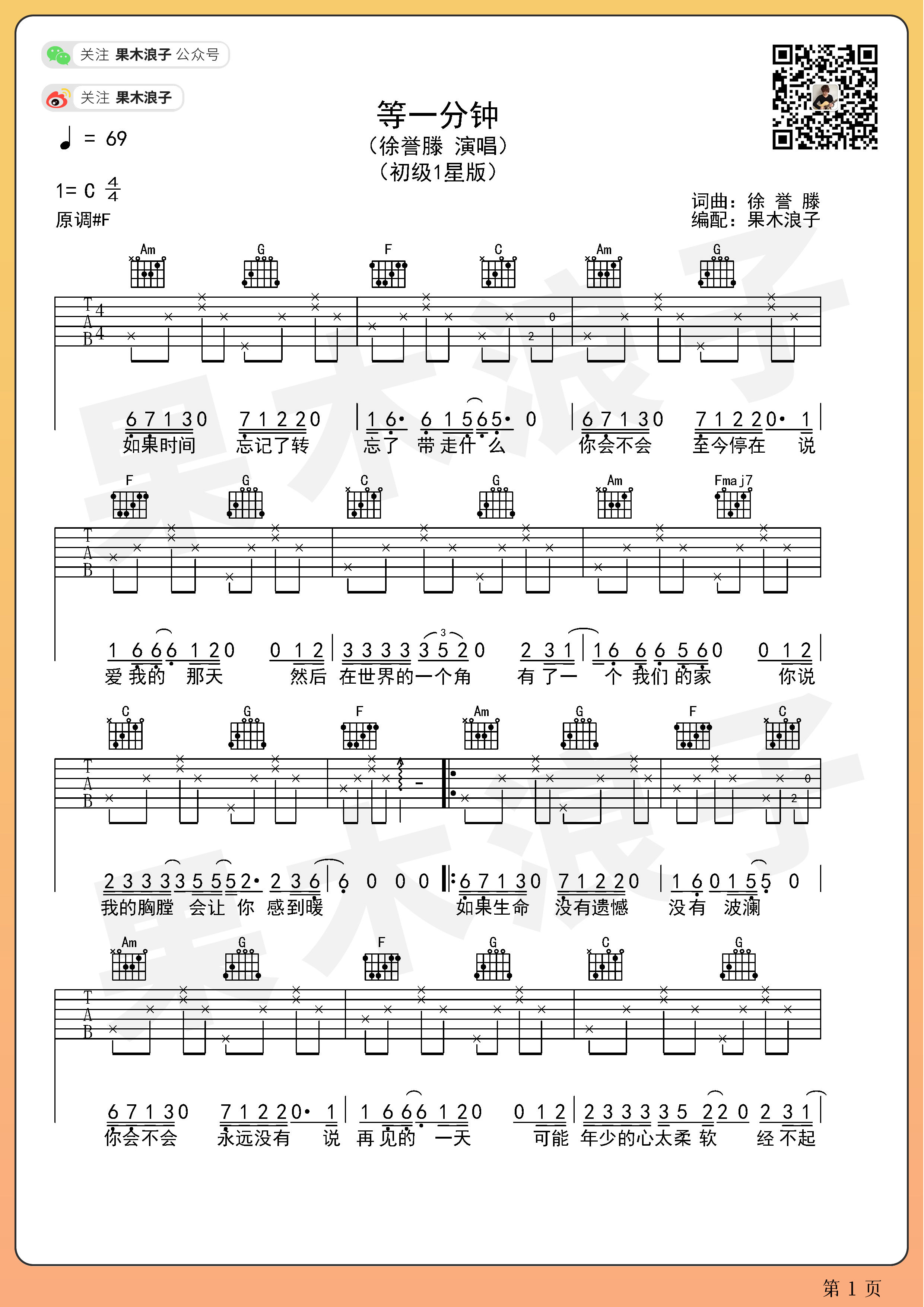 等一分钟吉他谱,它是演唱的原版歌曲简单易学,曲风抒情,由果木浪子制谱,是一首经典简单的吉他谱,适合新手学习和弦指弹的C调编配曲谱,弹唱时可,本次教学采用C调,是非常好听的弹唱曲谱,下面完整版高清六线谱由吉它谱大全为大家更新分享。有喜欢吉它的朋友欢迎关注!