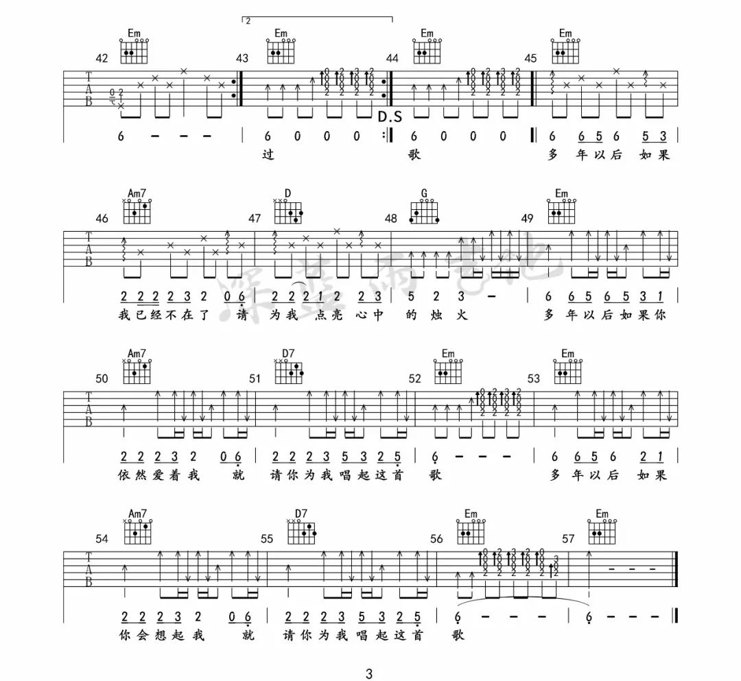 多年以后吉他谱,原版大欢歌曲,简单G调指弹曲谱,高清六线乐谱教学