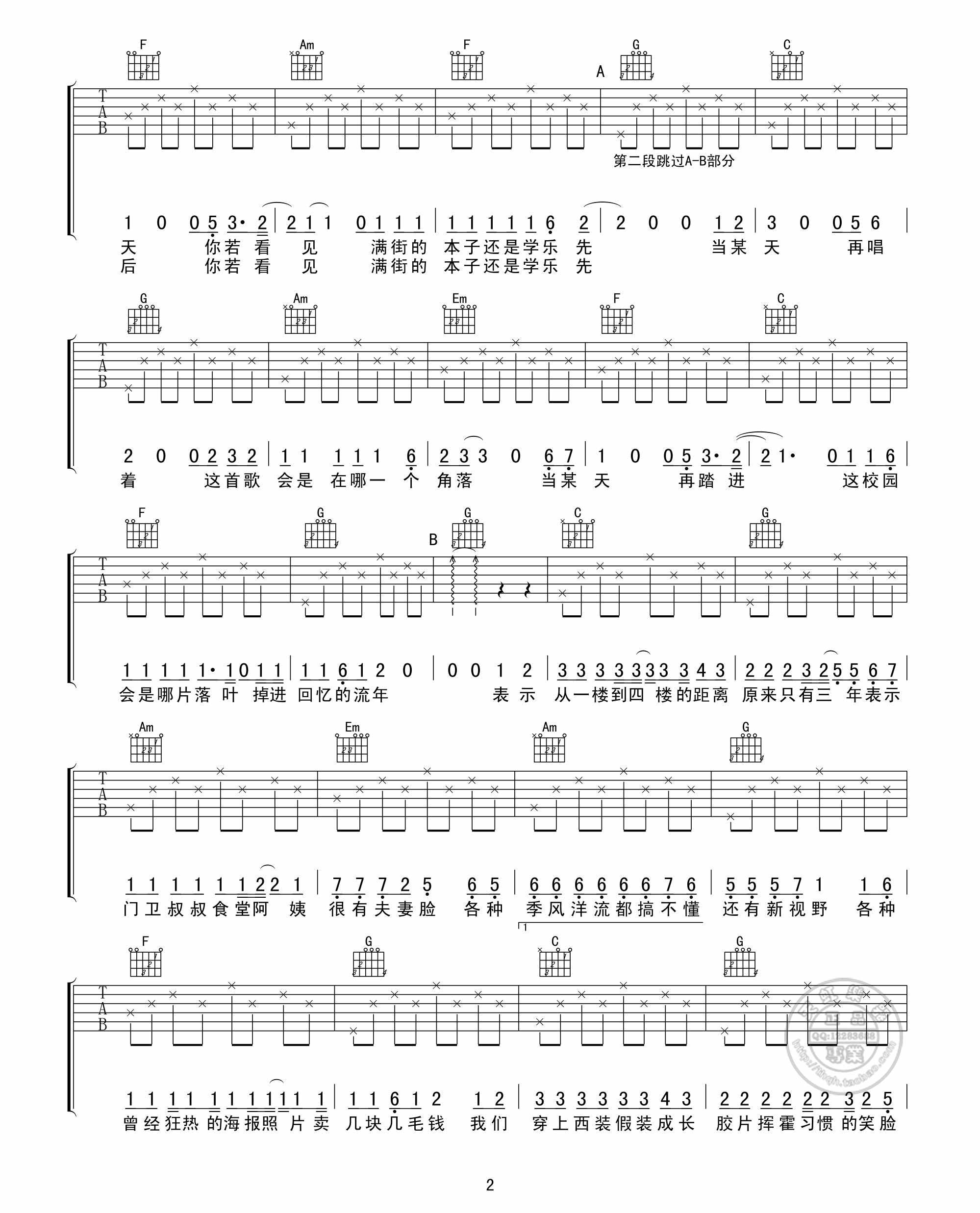 署前街少年吉他谱,取自演唱的歌曲是经典F调指弹编配的曲谱,非常好听的弹唱曲谱,下面3张高清曲谱由吉曲谱网为大家更新分享,有喜欢吉它的朋友欢迎关注!