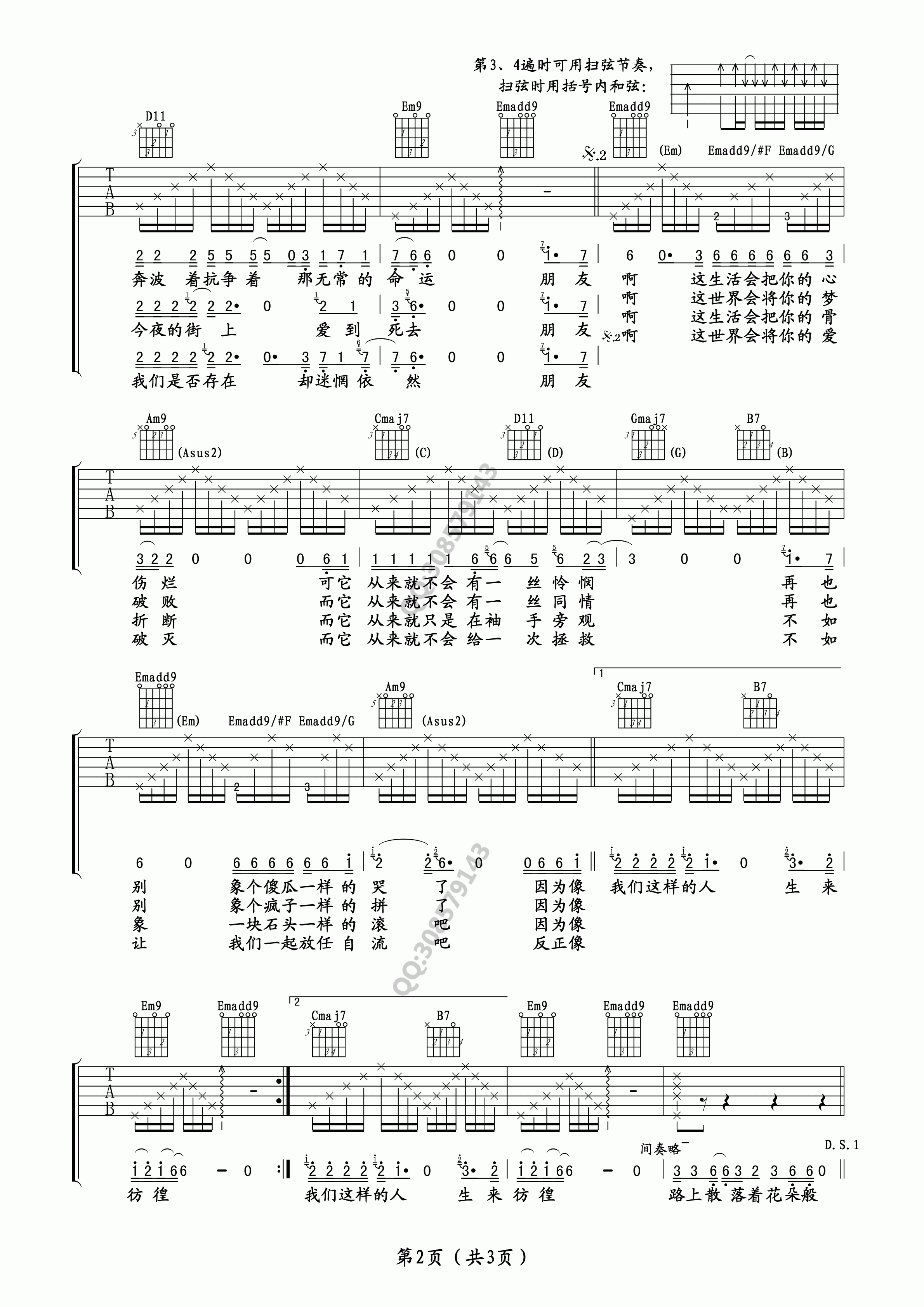 生来彷徨吉他谱,G调编配吉他弹唱六线谱,来自卢家兴老师编配制谱。歌曲演奏的节奏型较为简单,副歌部分第二遍演奏用扫弦伴奏,以体现原曲的力量感。