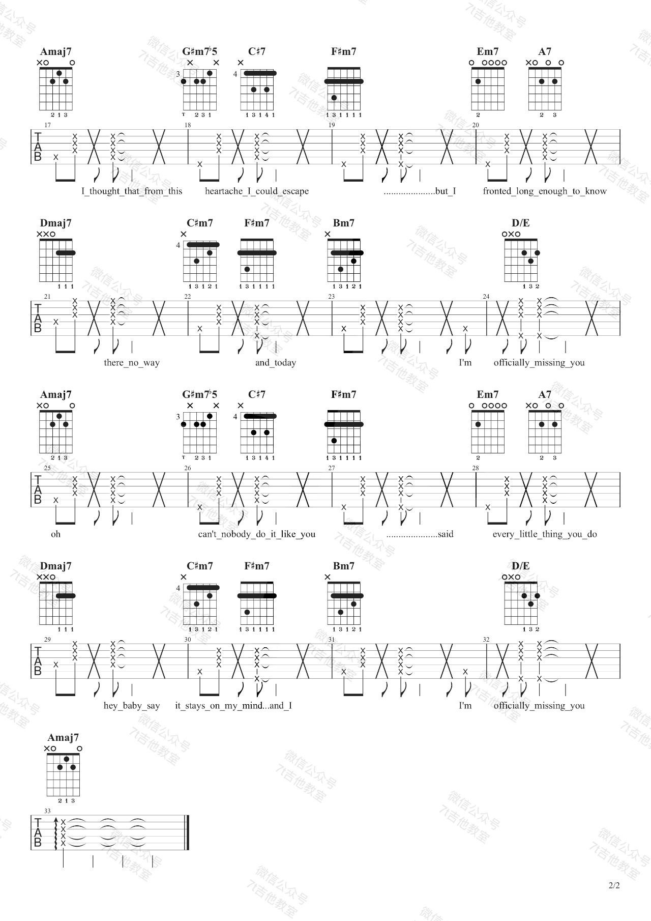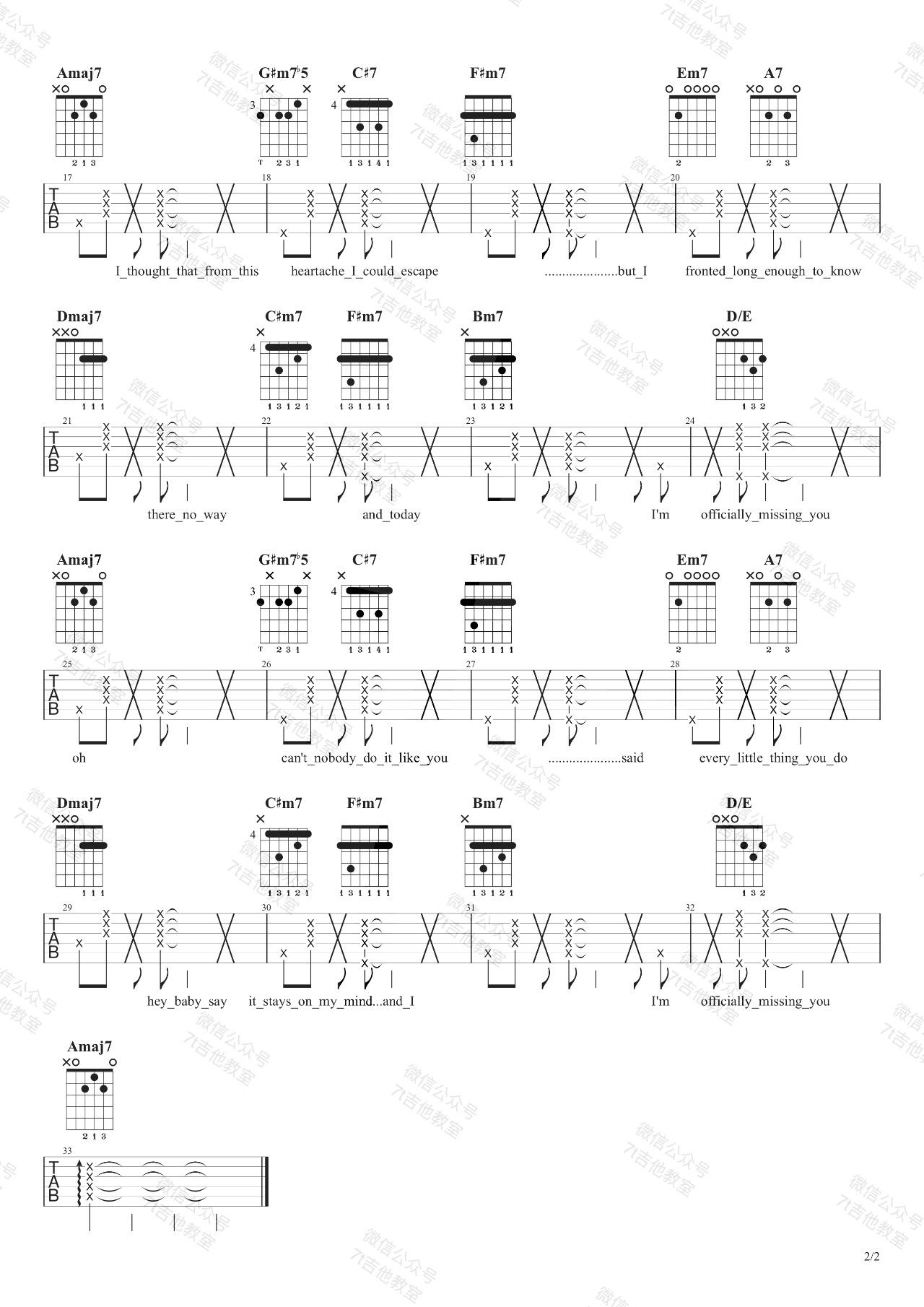 Officially Missing You吉他谱,A调版吉他弹唱谱,来自7t吉他教室编配分享,根据Tamia的演唱版编配。A调有几个和弦较难,节奏型每八个小节重复循环,在上方里有关于节奏型的详细讲解。