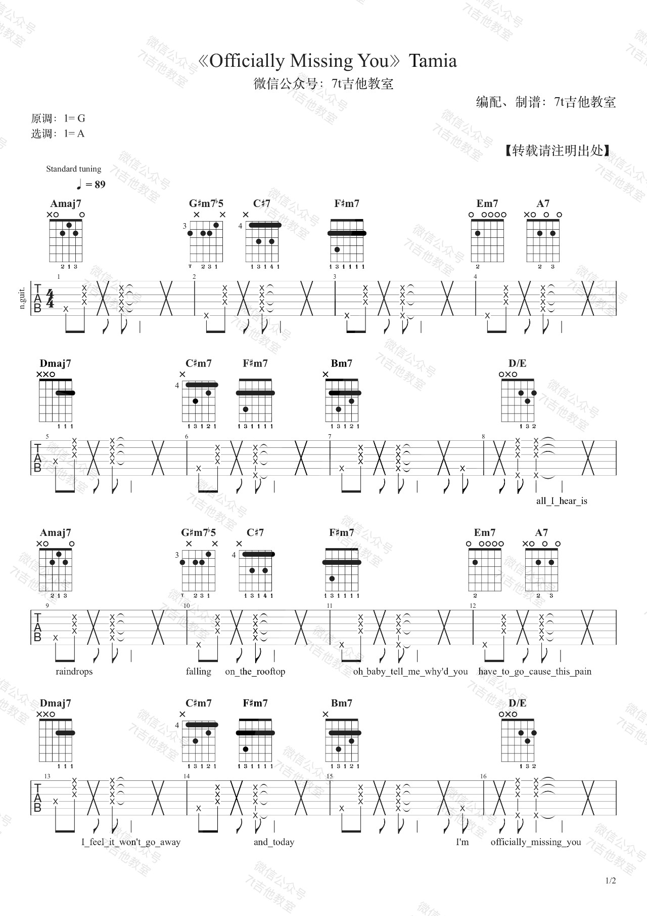 Officially Missing You吉他谱,它是演唱的原版歌曲,由7t吉他教室制谱,是一首经典简单的吉他谱,适合新手学习和弦指弹的A调编配曲谱,弹唱时可,原调吉他本次教学采用A调,是非常好听的弹唱曲谱,下面完整版高清六线谱由吉它谱大全为大家更新分享。有喜欢吉它的朋友欢迎关注!