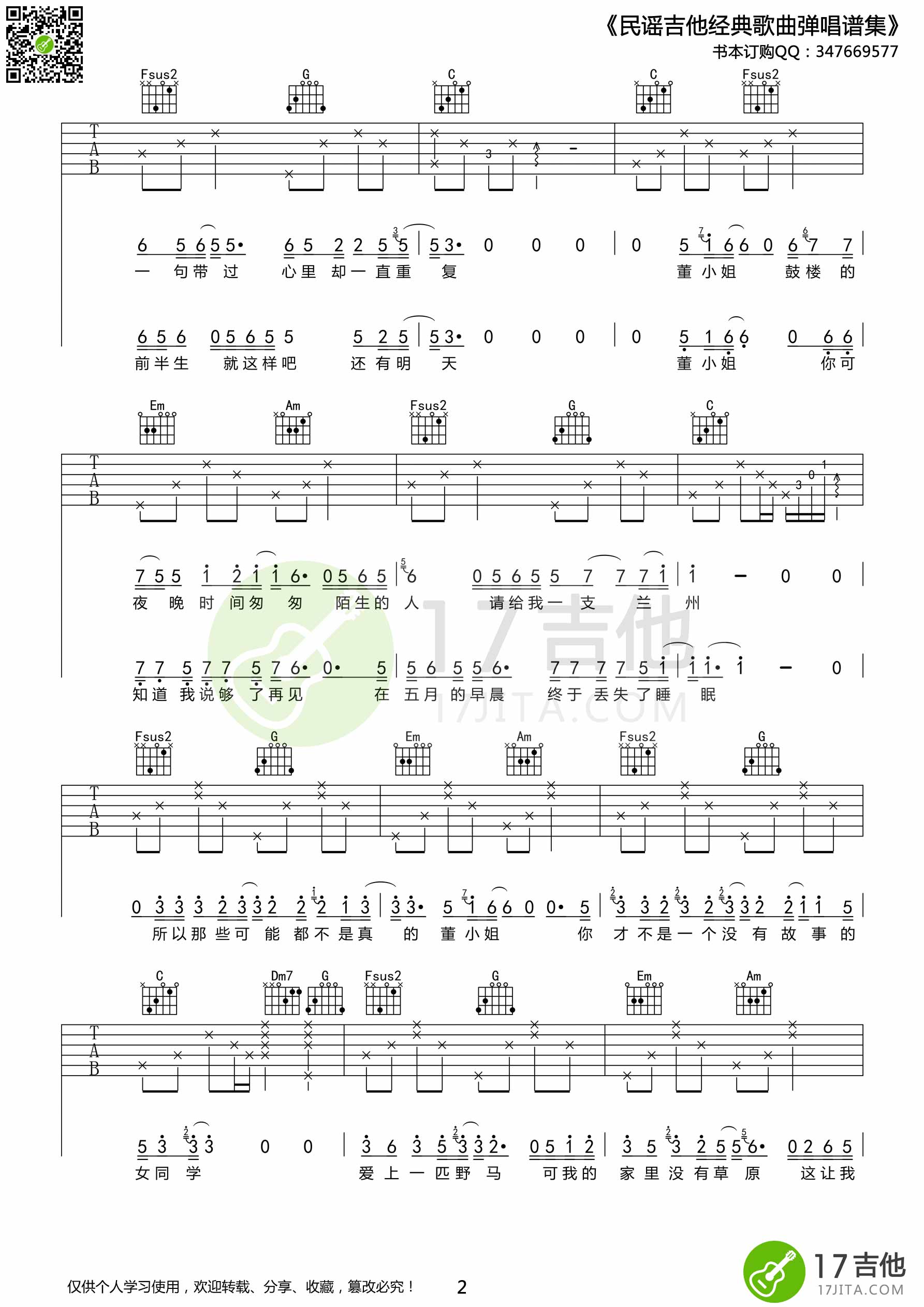 董小姐吉他谱,原版歌曲,简单E调弹唱教学,六线谱指弹简谱3张图
