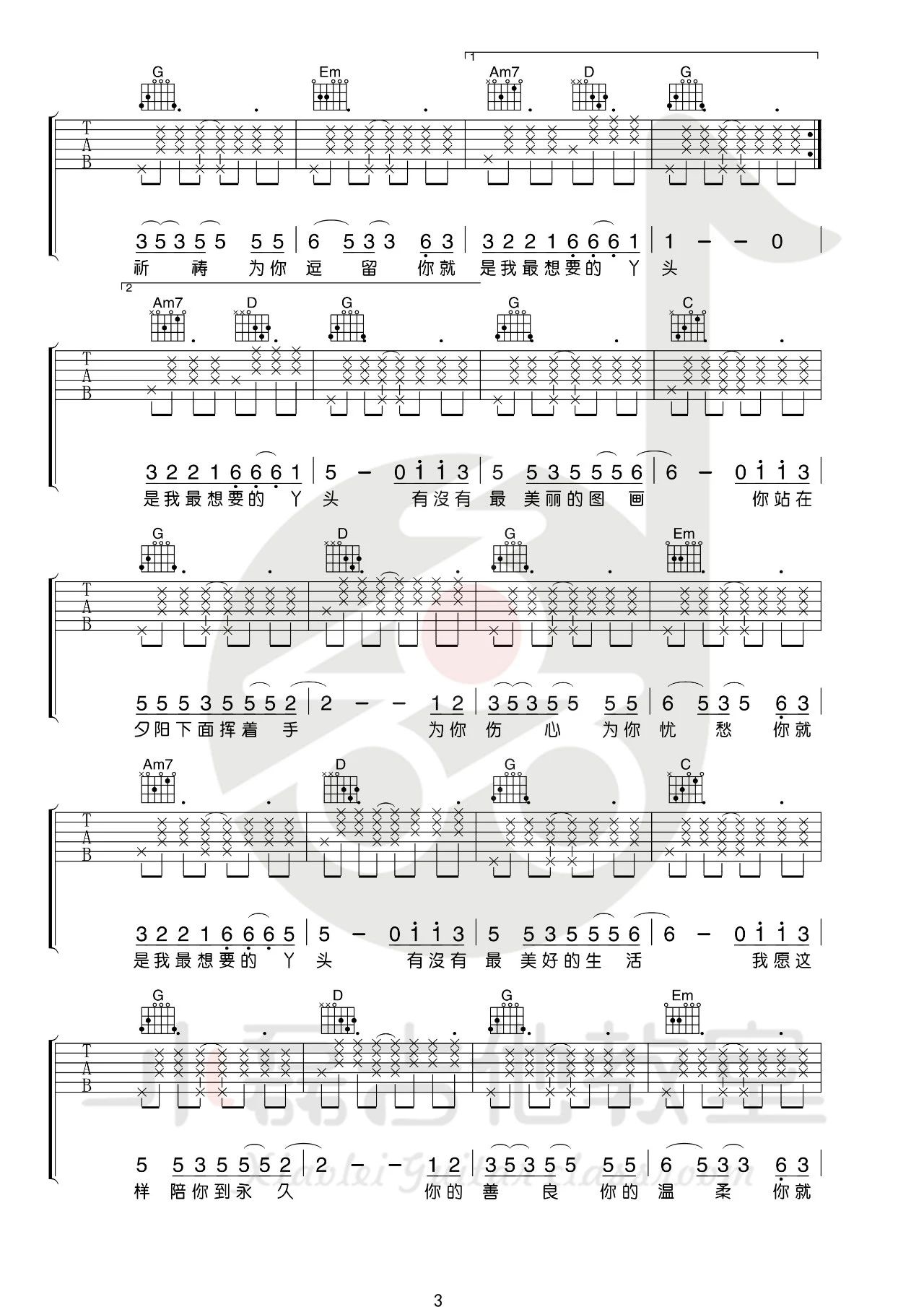 你就是我最想要的丫头吉他谱,G调版吉他六线谱,来自小磊吉他编配分享。整篇歌曲都是采用分解的伴奏指法来完成的,原版中也没有太多华丽的东西,和弦和演奏方法都算是初级水平编排,非常适合弹唱。