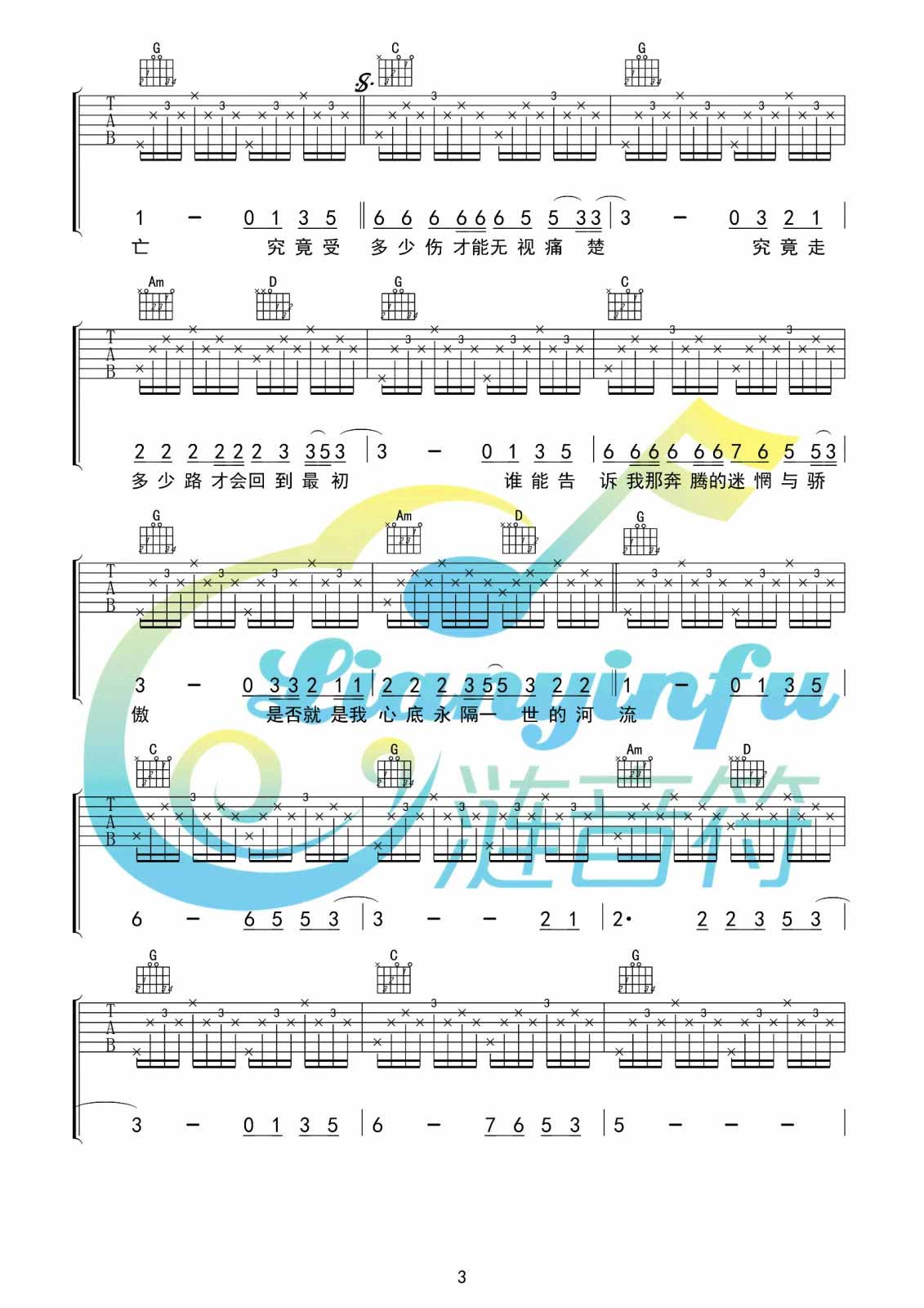 河流吉他谱,原版歌曲,简单G调弹唱教学,六线谱指弹简谱4张图