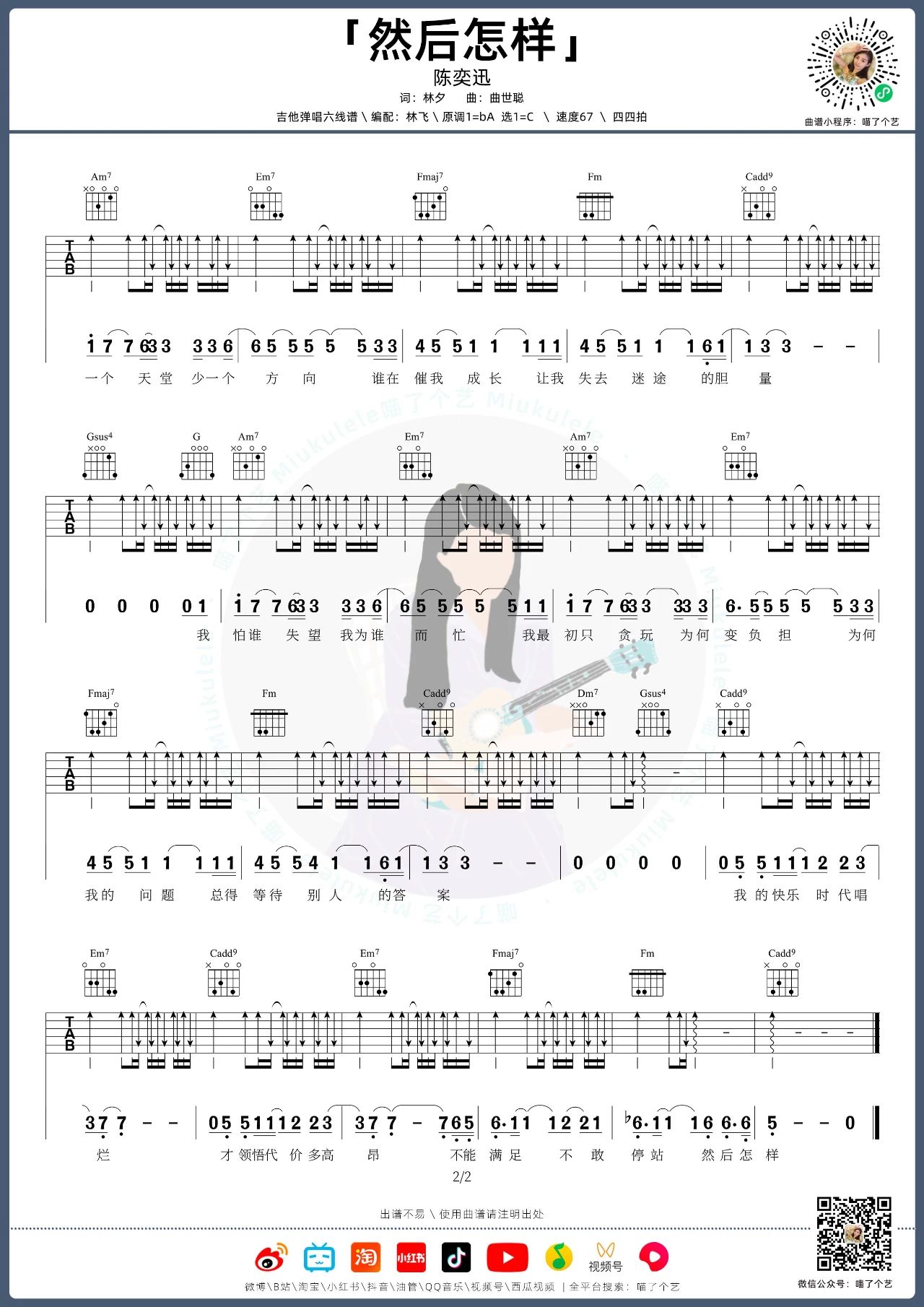然后怎样吉他谱,它是陈奕迅演唱的原版歌曲节奏稳定,旋律优美动听,由喵了个艺制谱,是一首经典简单的吉他谱,适合新手学习和弦指弹的C调编配曲谱,弹唱时可,原调版吉本次教学采用C调,是非常好听的弹唱曲谱,下面完整版高清六线谱由吉它谱大全为大家更新分享。有喜欢吉它的朋友欢迎关注!