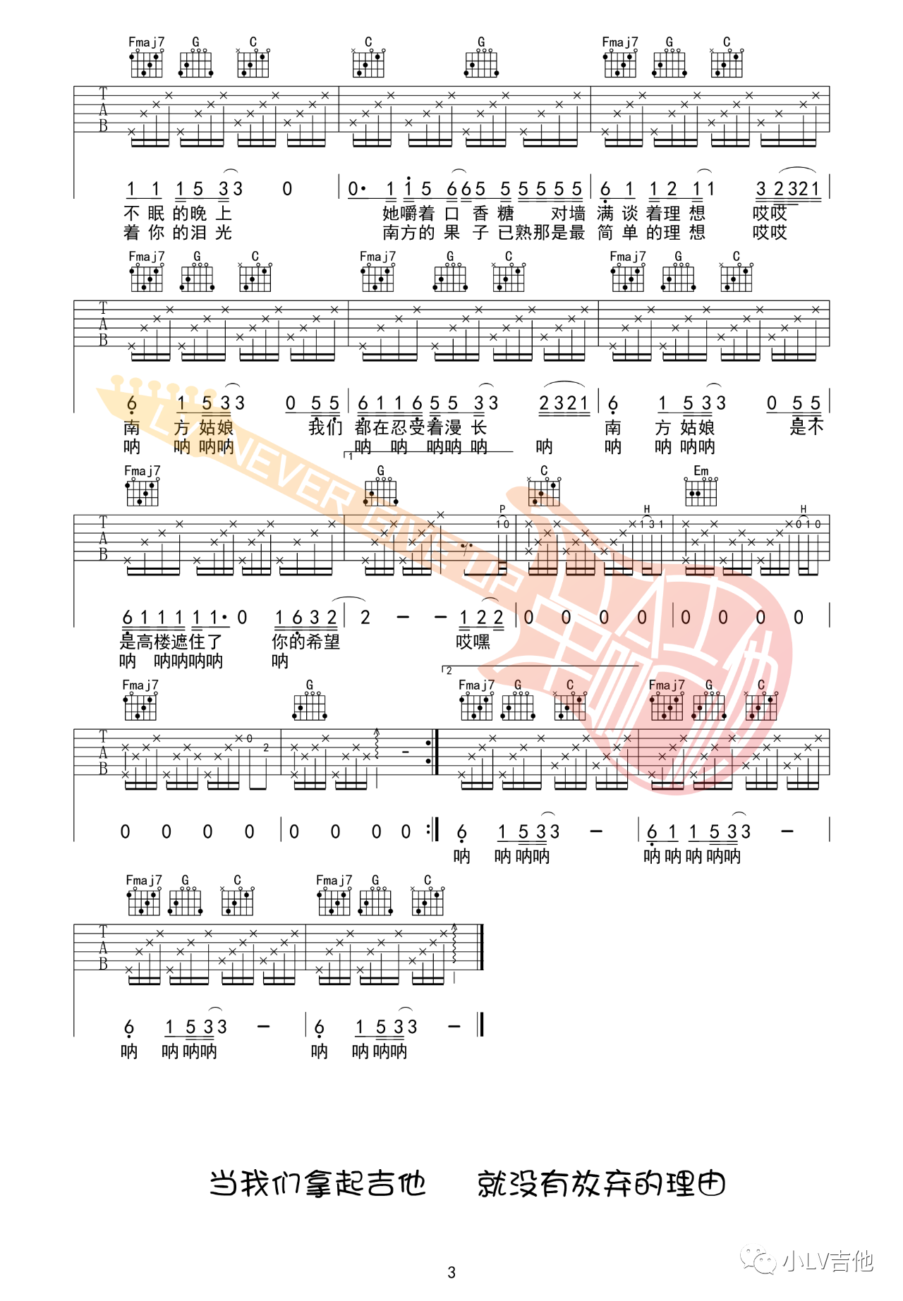 南方姑娘吉他谱,它是赵雷演唱的原版歌曲吉他演奏非常灵活,节奏感很强。,由革命吉他教室制谱,是一首经典简单的吉他谱,适合新手学习和弦指弹的南方编配曲谱,弹唱时可,原调F调本次教学采用南方,是非常好听的弹唱曲谱,下面完整版高清六线谱由吉它谱大全为大家更新分享。有喜欢吉它的朋友欢迎关注!