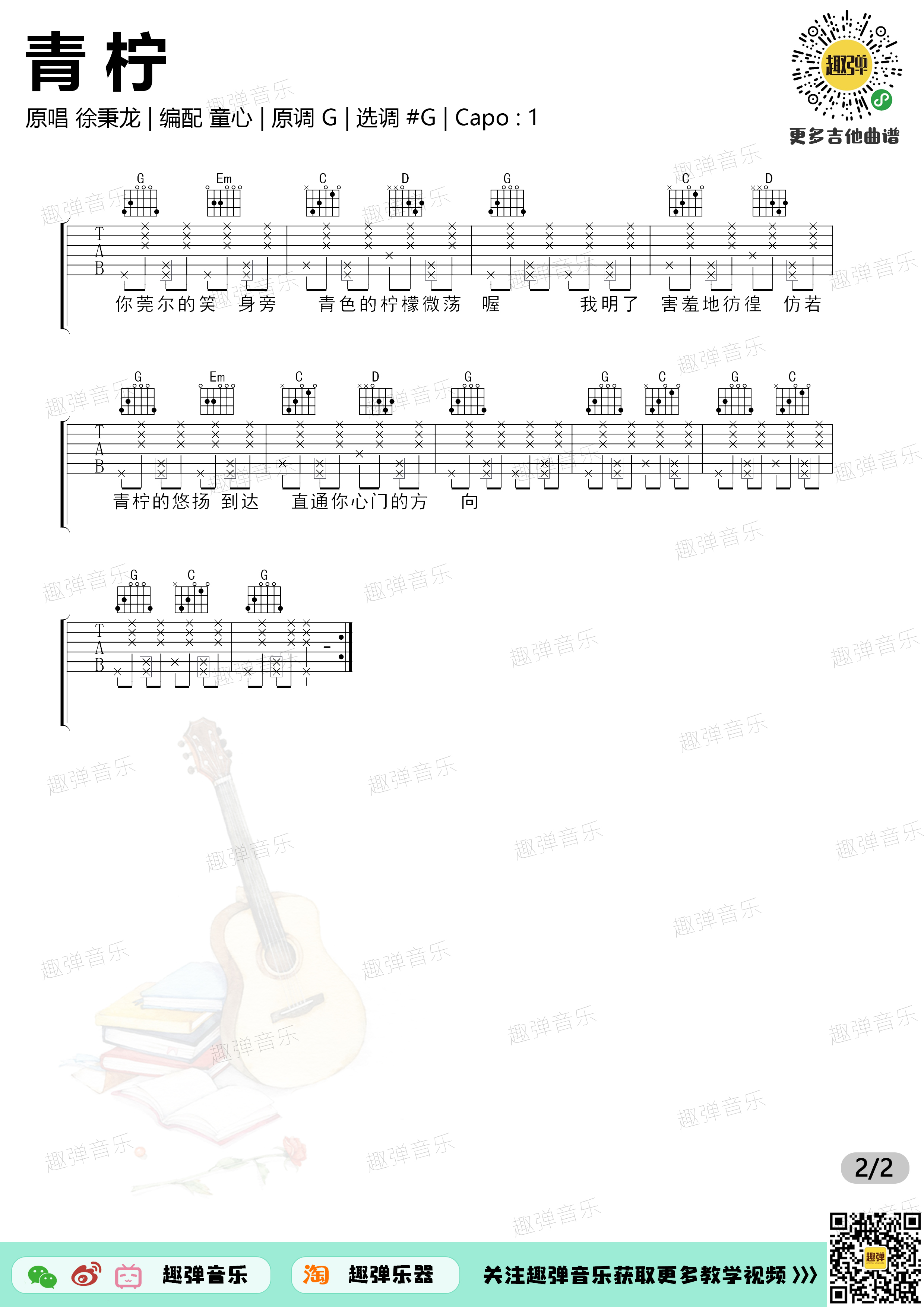 以上就是G调版的青柠吉他谱_徐秉龙_G调高清版吉他六线谱 ,如果正是您所寻找的六线高清图片谱,希望能收藏本站,这里会源源不断更新各种徐秉龙的曲谱。如果你已经掌握了一定的弹奏技巧,那么扫弦、指弹、和弦、指法等更高级的技巧也能在吉它谱网站中找到对应的教程和独奏谱子