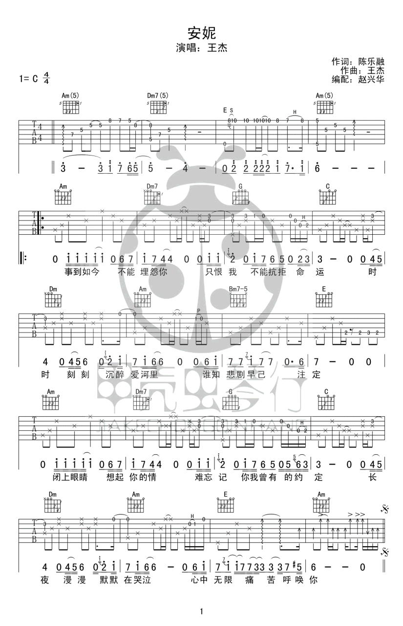 安妮吉他谱,王杰歌曲,C调指弹简谱,新手弹唱高清版