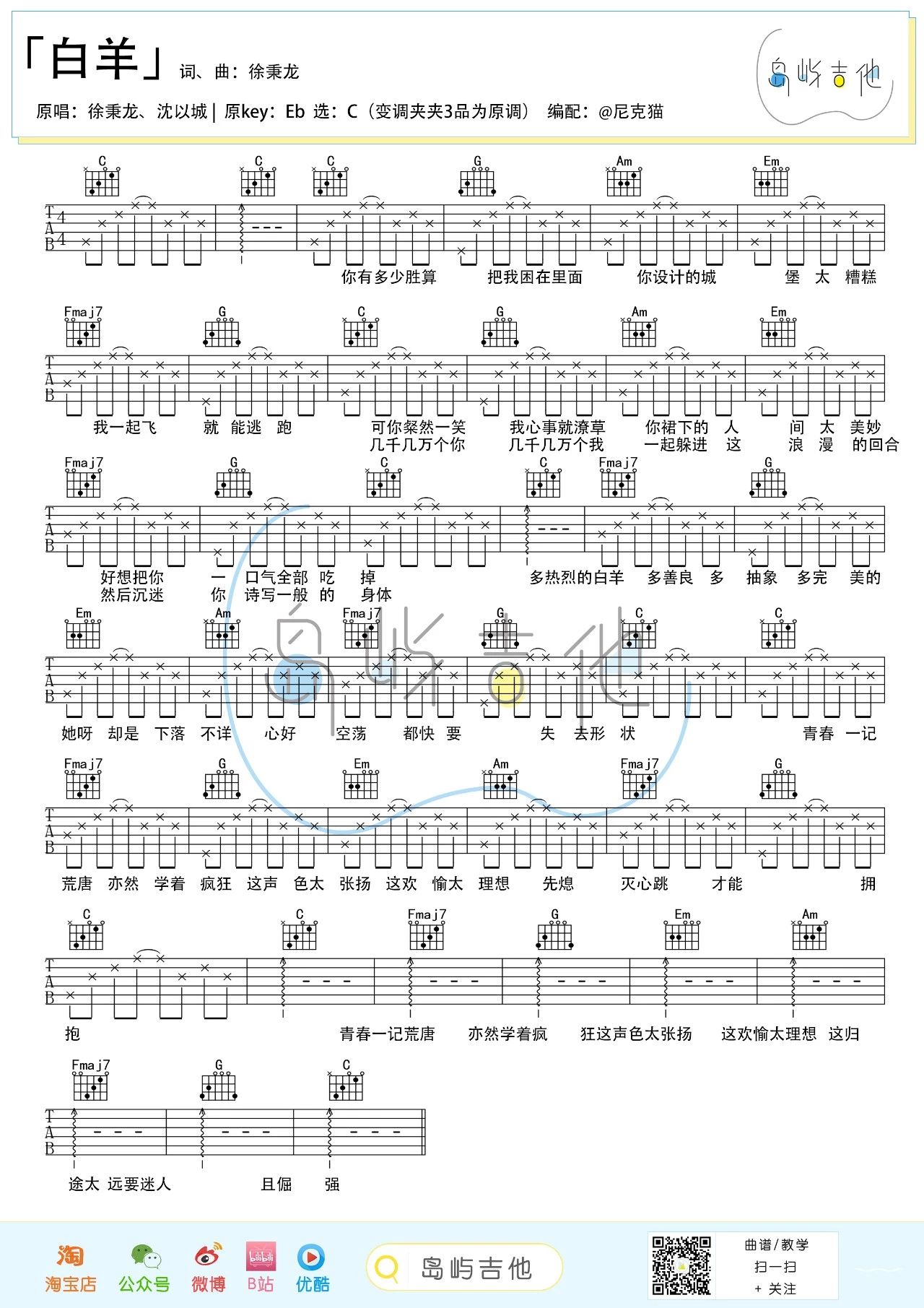 徐秉龙&沈以诚白羊吉他谱,简单C调原版指弹曲谱,沈以诚高清六线乐谱