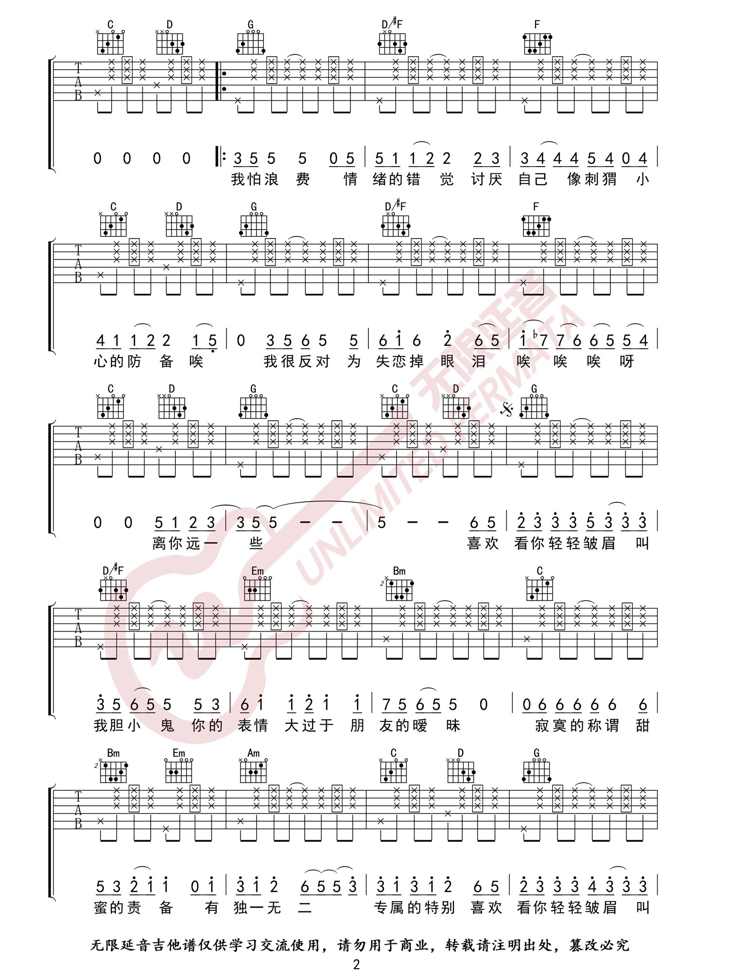 胆小鬼吉他谱,原版梁咏琪歌曲,简单G调指弹曲谱,高清六线乐谱