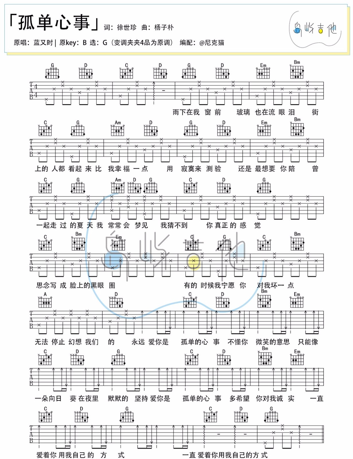 《《孤单心事》吉他谱_蓝又时_G调简单版弹唱高清六线谱免费分享,《孤单心事》这个歌曲由蓝又时演唱。爱而不得不是因为自己不够努力,而是那个人装作不知道。爱情是两个人的事情,但仔细斟酌就会发现歌中所唱的爱,显然成了一个人的执着。此版本的曲谱来源于岛屿吉他扒谱制谱,歌曲原调为B调,这里采用G调指法进行编配,演唱时夹变调夹4品回到原调。这个歌曲编配的非常简单,都是基础的节奏型加上基础的和弦,很适合新手朋友练习。