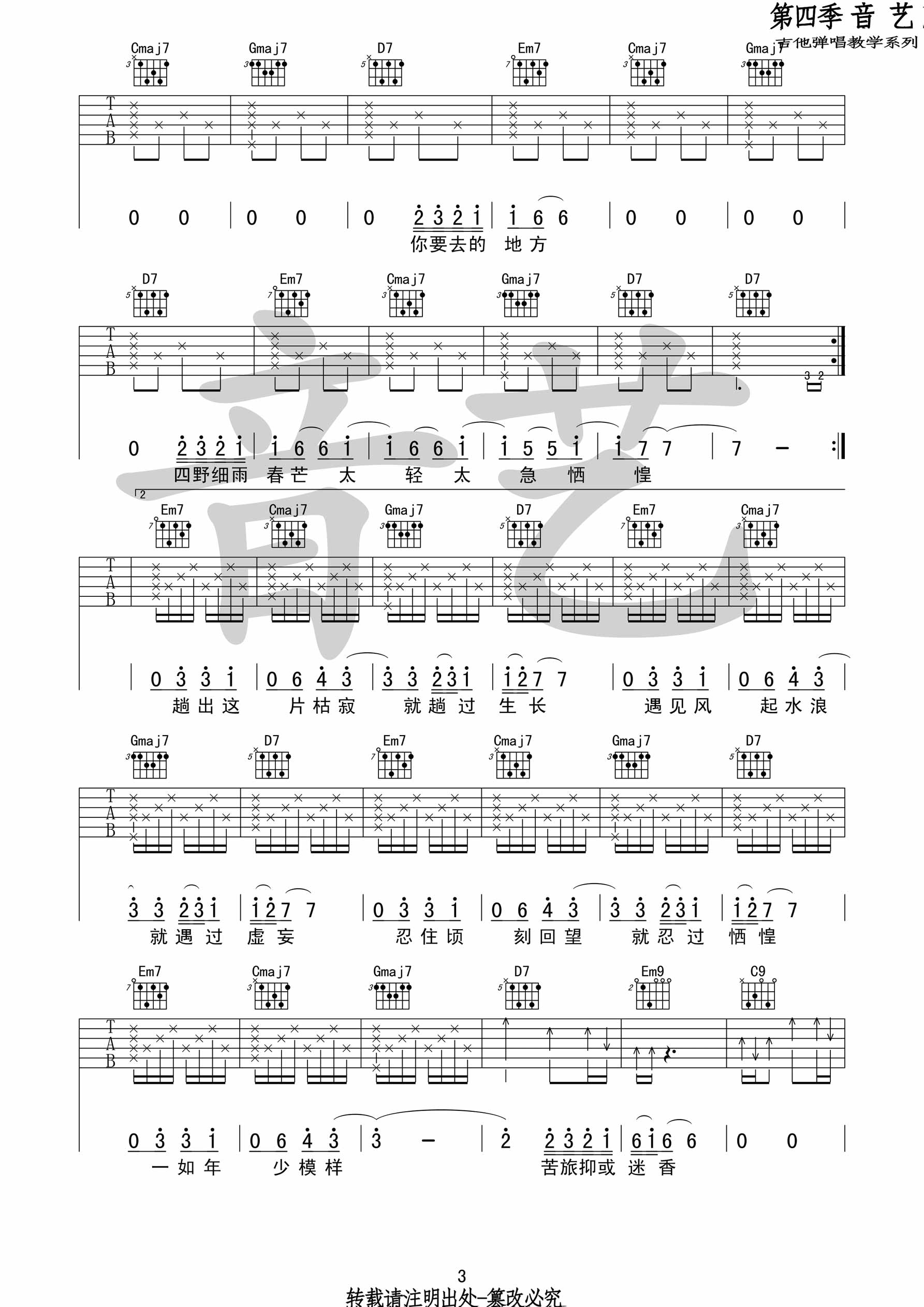 途中吉他谱,原版歌曲,简单G调弹唱教学,六线谱指弹简谱4张图