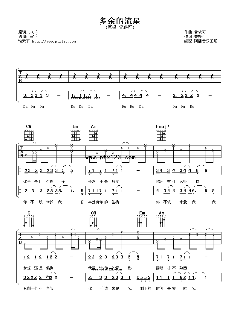 多余的流星吉他谱,曾轶可歌曲,C调指弹简谱,新手弹唱女生版