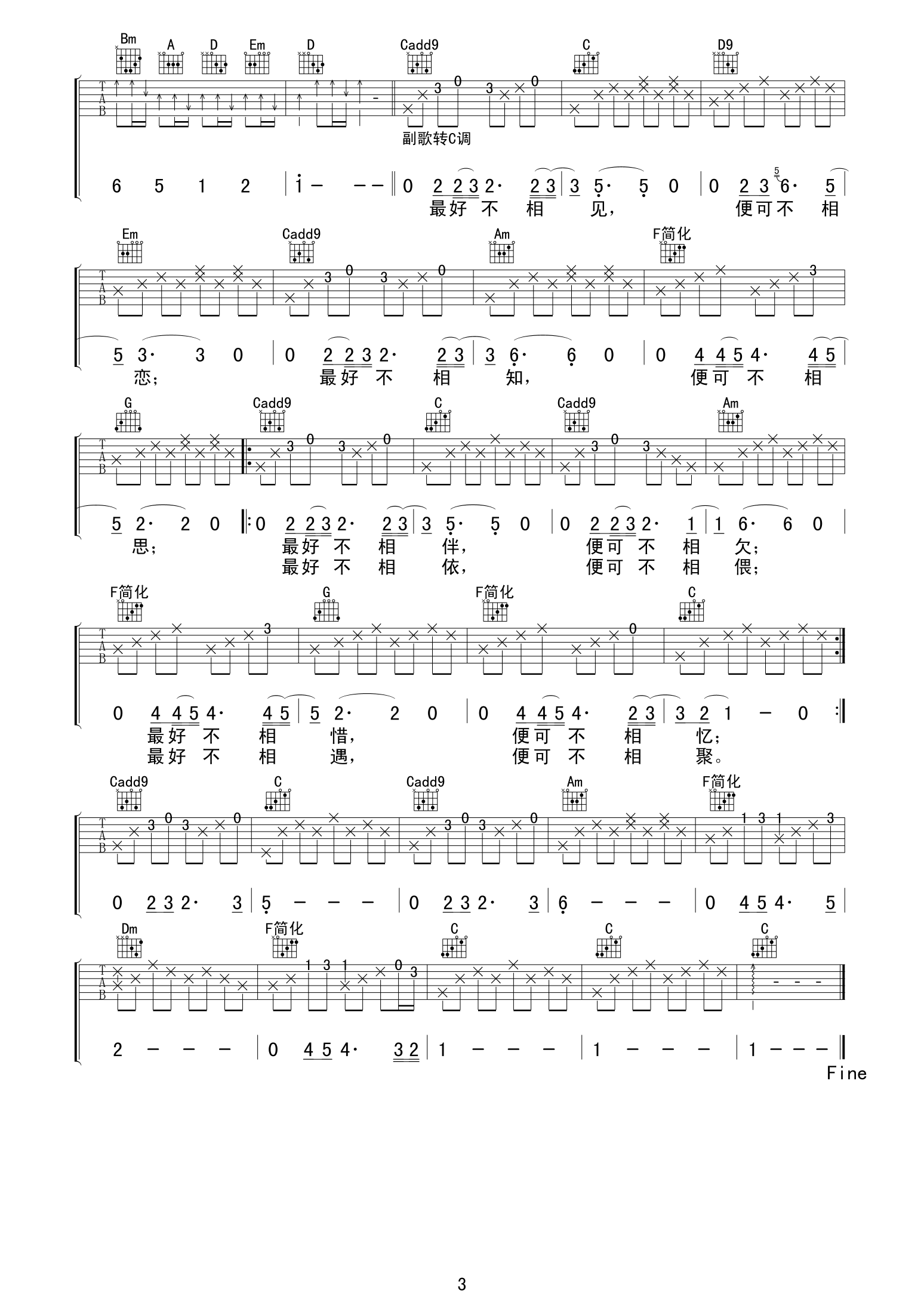 最好不相见吉他谱本曲谱是选用了C调指法,由老知了编配完成。爱可以让人勇敢,也可以让人胆怯,尤其是在分开以后,往日温柔的瞬间全部坍塌,你看着满地记忆的碎片,却没有勇气去拼凑完整,你习惯了跟时间耗,跟思念耗,有些感情,是可以被说出口的,而有些感情,只能埋藏在心里,成为不为人知的秘密,最好不相见,以后只是活在彼此的柜子里面就好了,这样的我们之间或许是最好的状态了。