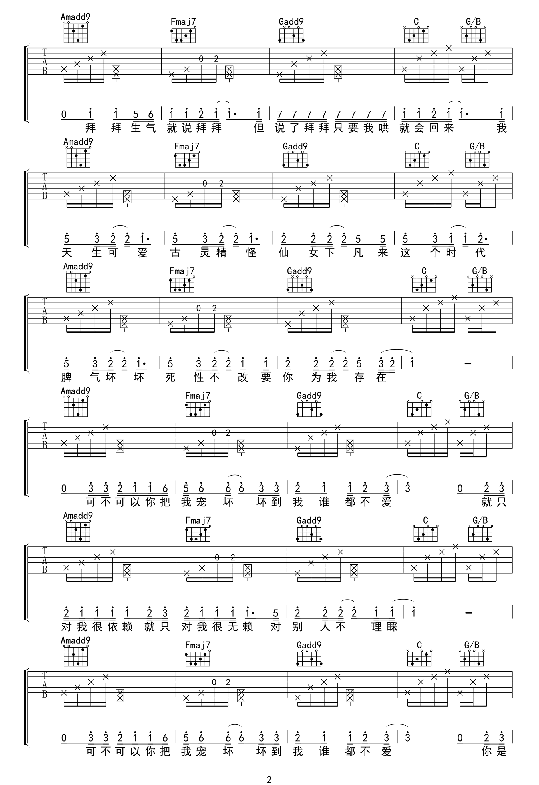 《宠坏吉他谱_李俊佑/小潘潘_《宠坏》C调原版弹唱谱_高清六线谱分享,《宠坏》这个歌曲是由李俊佑和小潘潘一起演唱的歌曲。乖乖虽然有些不乖,如果我喜欢所有缺点都不用改,拜拜生气就说拜拜,但说了拜拜只要我哄就会回来。此版本的曲谱来源于吴先生扒谱制谱,歌曲原调为D调,这里采用C调指法根据原版进行编配,演唱时夹变调夹2品回到原调。曲谱适用了拍弦技巧来编配,更加增添了原曲俏皮可爱的味道。