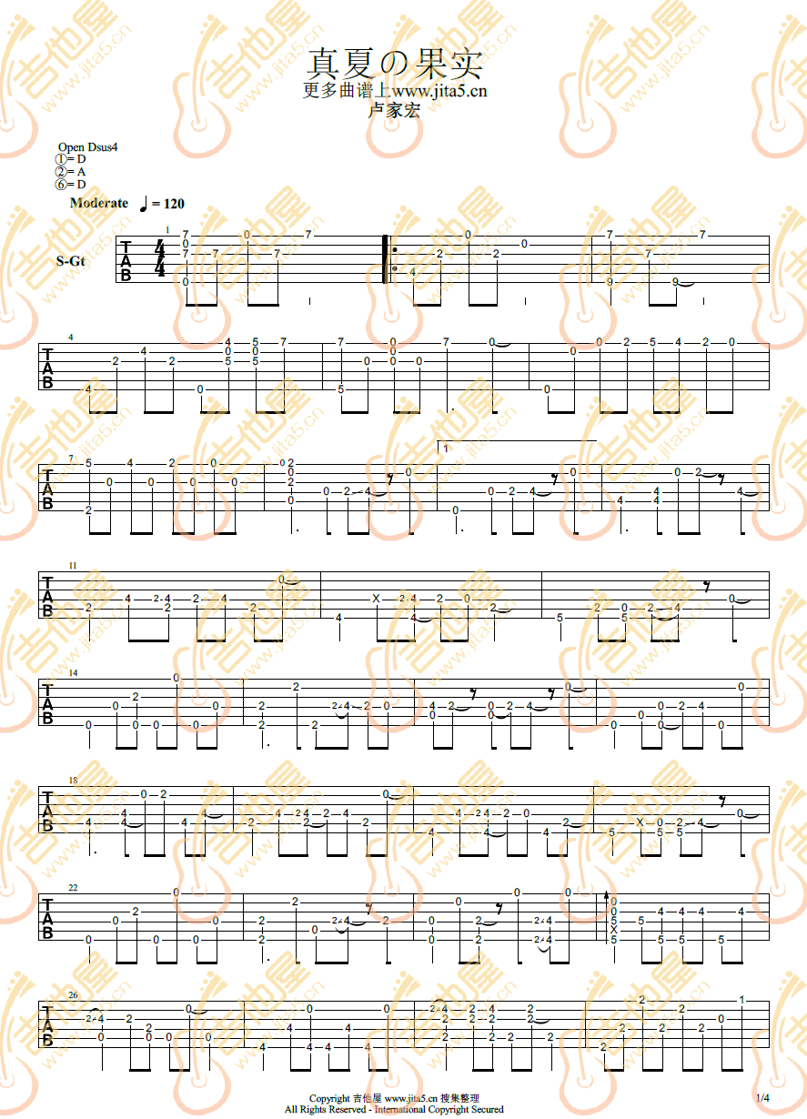 真夏的果实吉他谱,原版卢家宏歌曲,简单指弹曲谱,高清六线乐谱