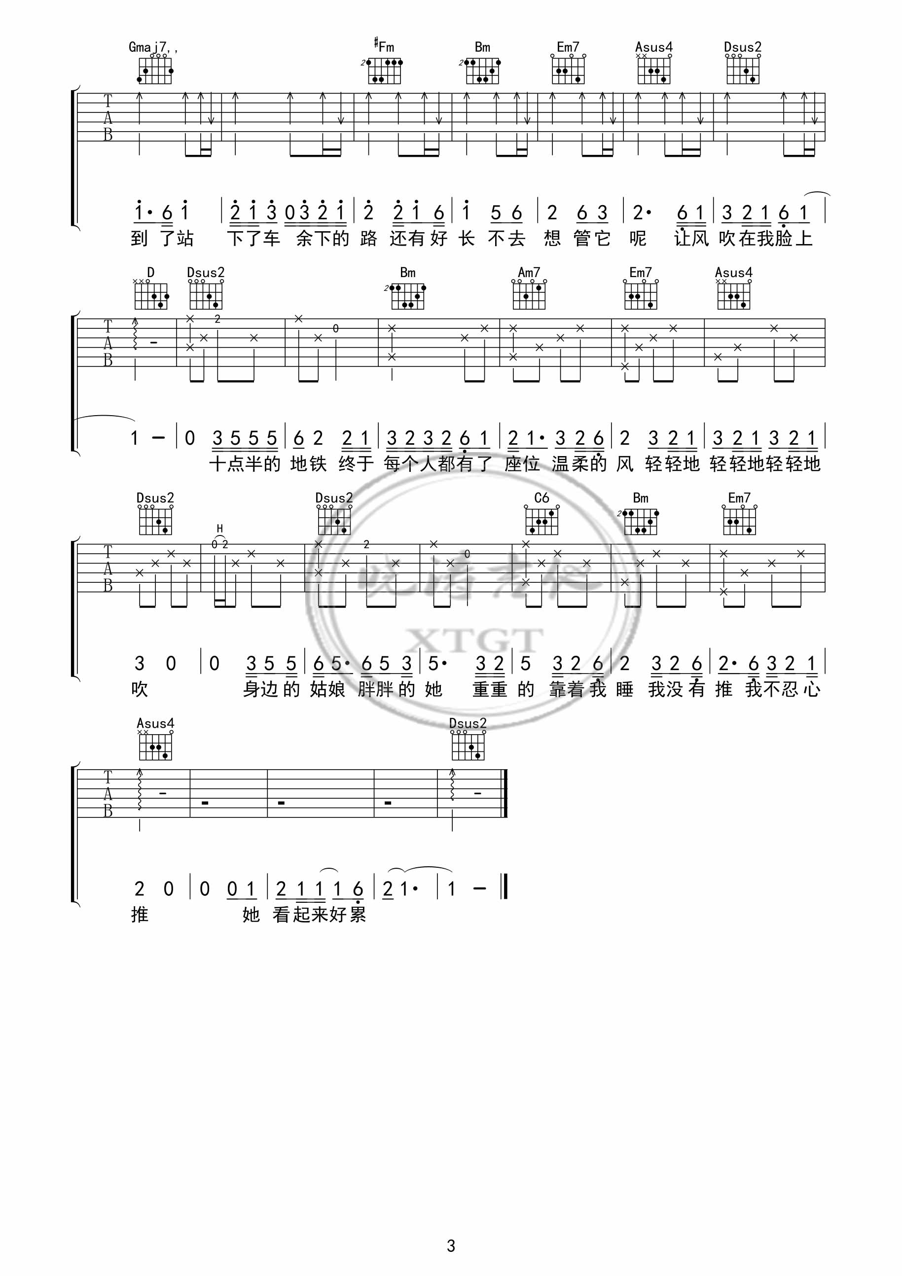十点半的地铁吉他谱,原版歌曲,简单D调弹唱教学,六线谱指弹简谱3张图