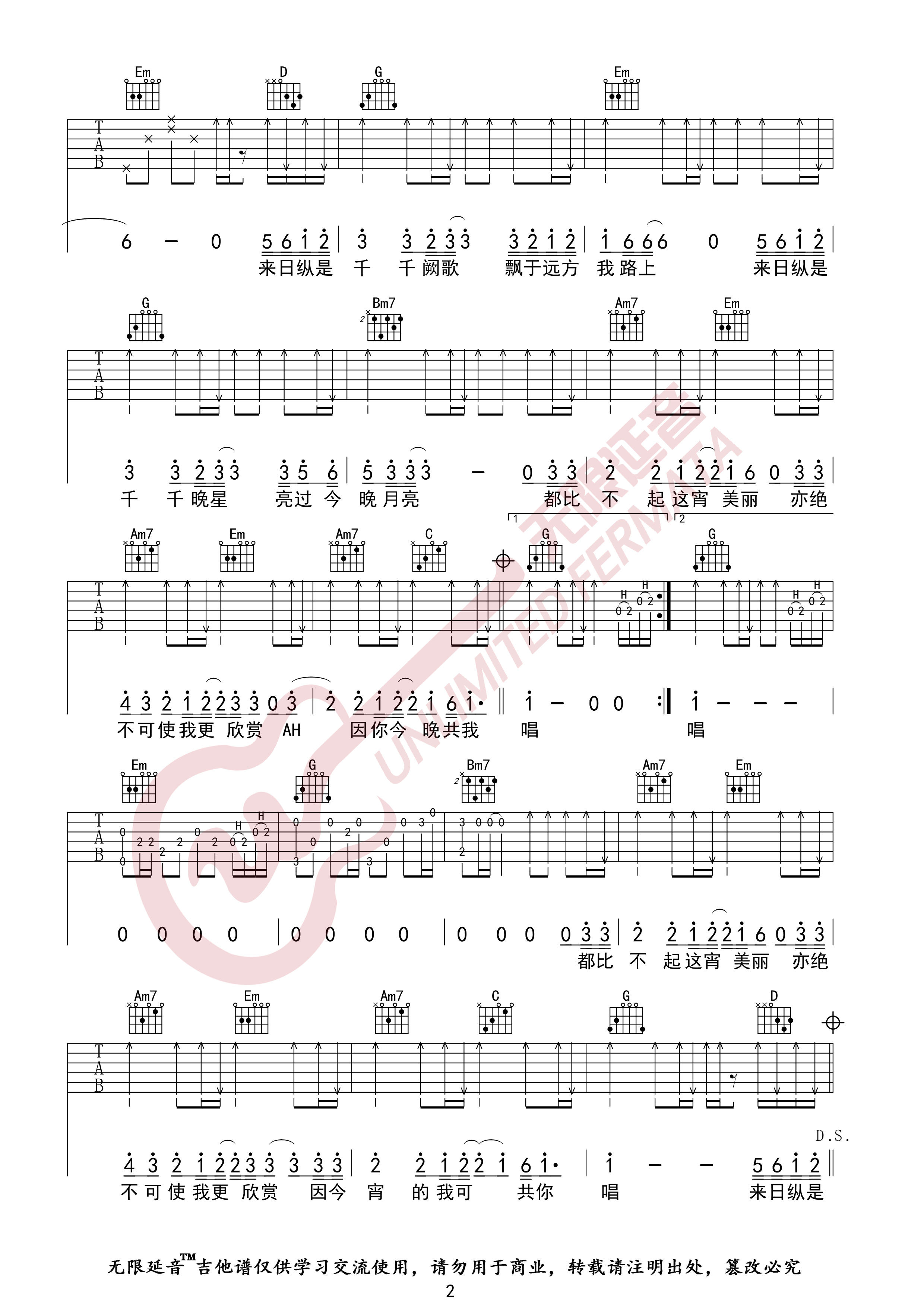 千千阙歌吉他谱,它是陈慧娴演唱的原版歌曲弹唱感人,曲风充满激情,由无限延音制谱,是一首经典简单的吉他谱,适合新手学习和弦指弹的G调编配曲谱,弹唱时可,原调E调本次教学采用G调,是非常好听的弹唱曲谱,下面完整版高清六线谱由吉它谱大全为大家更新分享。有喜欢吉它的朋友欢迎关注!