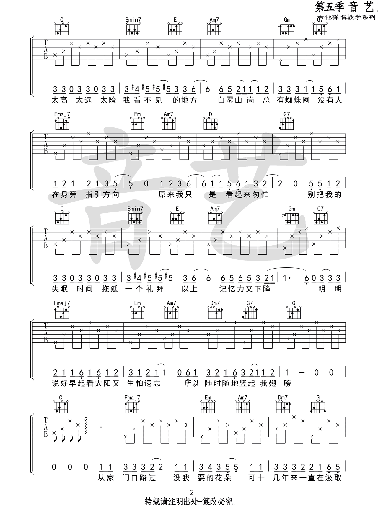 蜜蜂吉他谱,原版万玲琳歌曲,简单C调指弹曲谱,高清六线乐谱