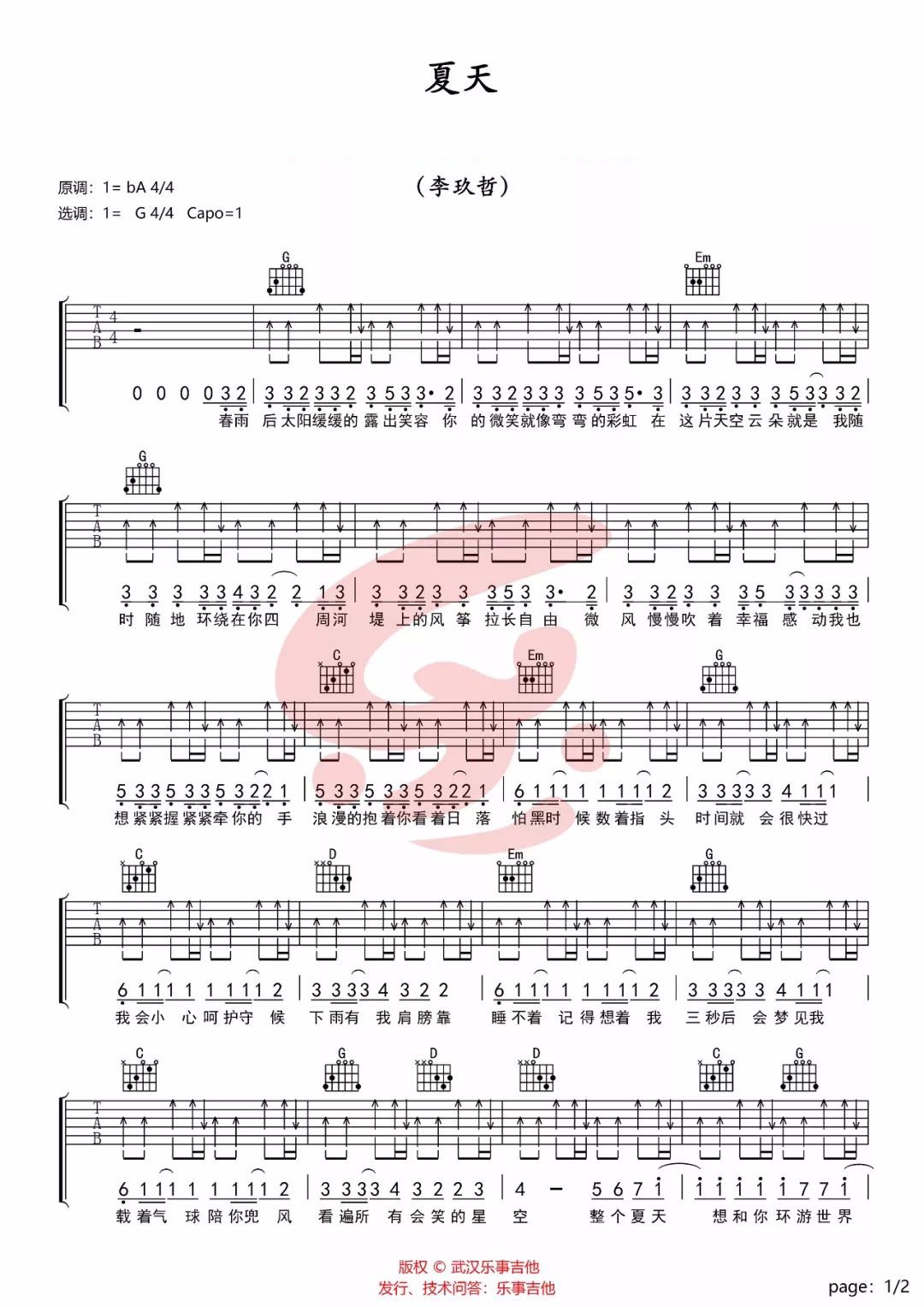 《夏天吉他谱_李玖哲_《夏天》G调简单版弹唱高清六线谱免费分享,《夏天》这个歌曲是由偶像周杰伦作曲,韩国歌手李玖哲演唱的一首经典歌曲。杰伦出品,必属精品,再加上李玖哲的唱功,确是一个很好的作品。此版本的曲谱来源于武汉乐事吉他,采用G调指法编配,歌曲原调为降A调,演唱时夹变调夹1品。这里为了照顾新手,省略了前奏的编配,直接进入主歌开始扫弦,然后演唱。