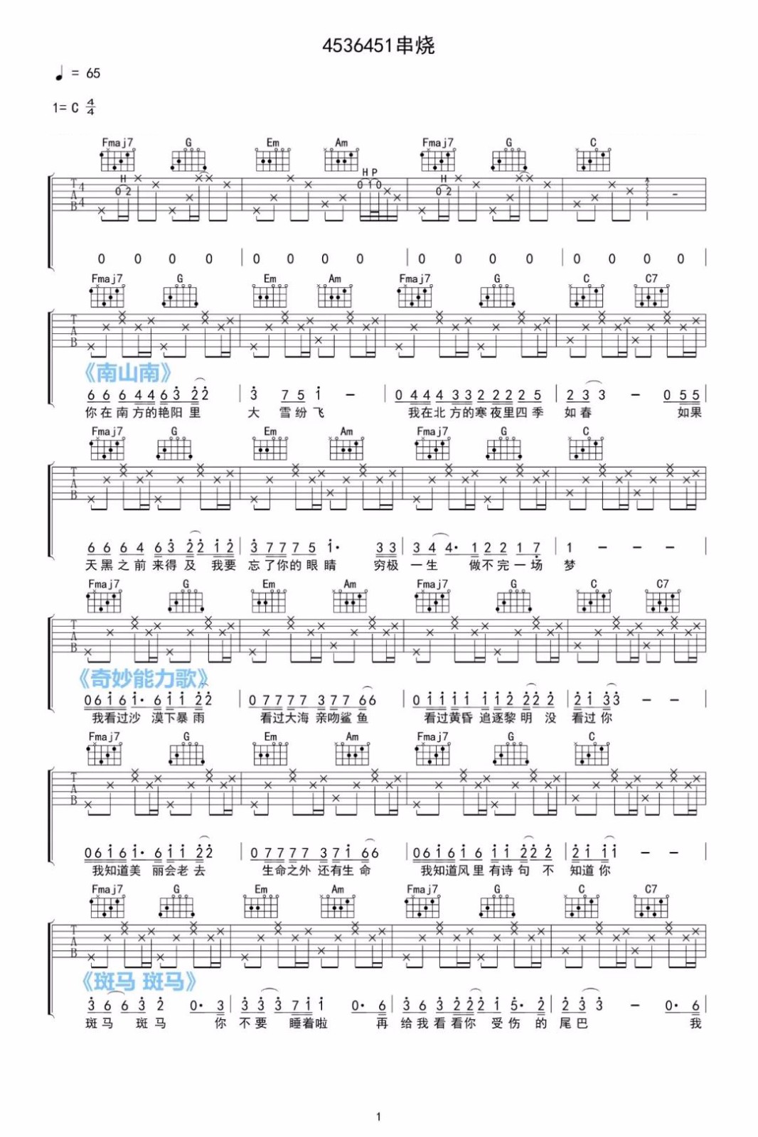 《神奇的4536451吉他谱_Simba舒展_串烧吉他谱_C调指法编配分享,《神奇的4536451》由Simba舒展演唱,这个曲子非常有意思的串烧歌曲,它融合了南山南、奇妙能力歌、斑马斑马、董小姐、往后余生、可惜不是你、我真的受伤了等歌曲,其实还可以更多,因为这些歌的和弦走向都是4536451,只要是这个走向的歌,都能串进去,这里是采用C调和弦来编配的,有兴趣可以自己将更多歌串进去哦。
