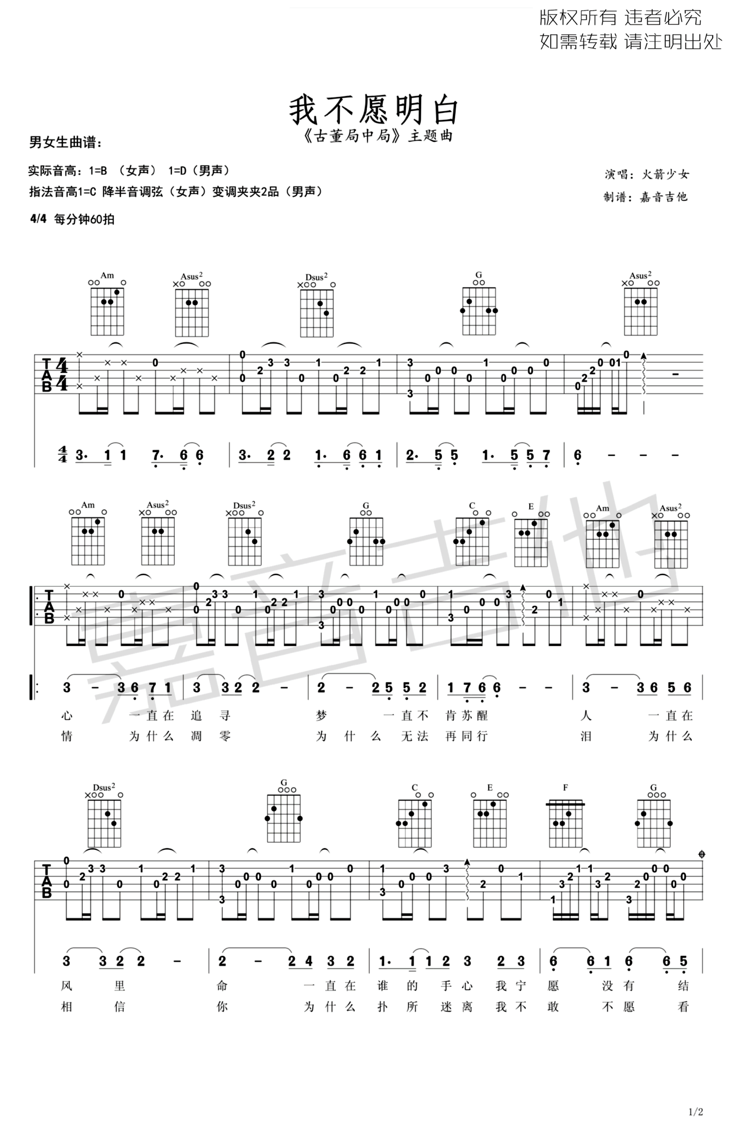 《《我不愿明白》吉他谱_段奥娟_C调原版六线谱_吉他弹唱教学分享,《我不愿明白》这个歌曲由火箭少女101成员段奥娟演唱,歌曲作为电影《古董局中局》的推广歌曲,很好听的一首歌,段奥娟的唱功也非常不错。曲谱来源于嘉音吉他,歌曲原调为D调,这里采用C调指法原版编配,女生降半音演唱,男生建议夹变调夹2品或更高。