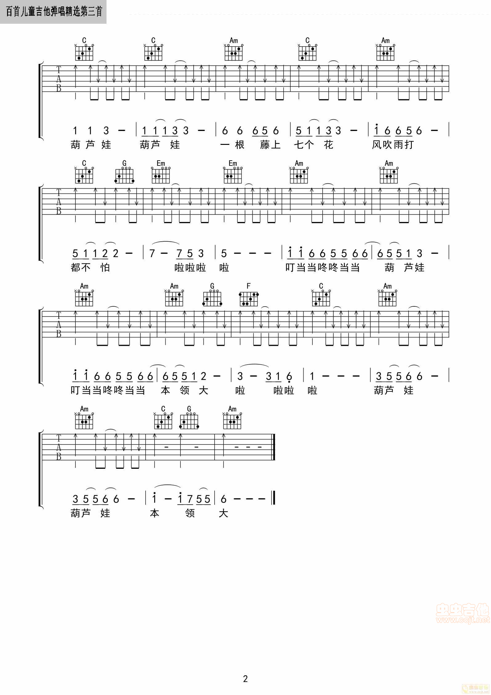 葫芦娃C吉他谱,原版歌曲,简单D调弹唱教学,六线谱指弹简谱2张图