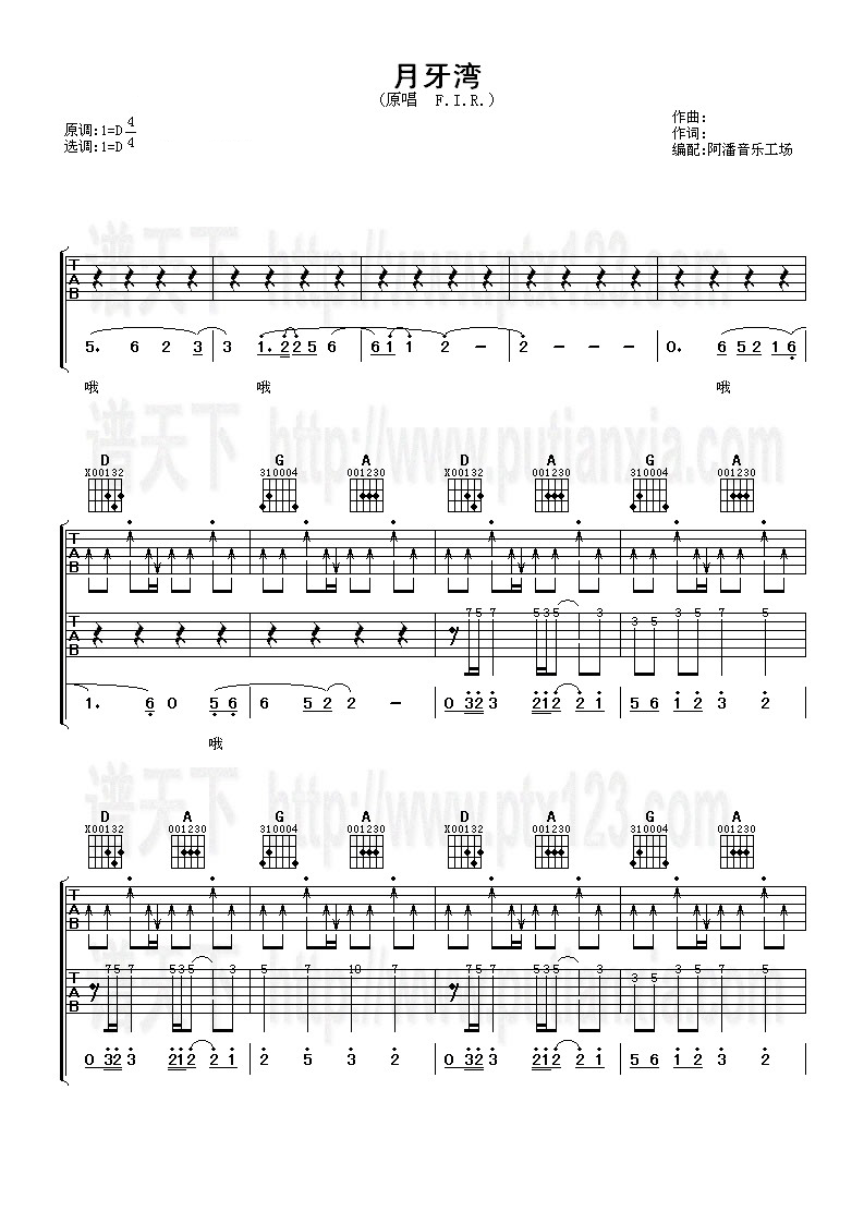 以上就是D调月牙湾吉它谱,如果正是您所寻找的飞儿乐团六线高清图片谱,希望能收藏本站,这里会源源不断更新各种的曲谱。