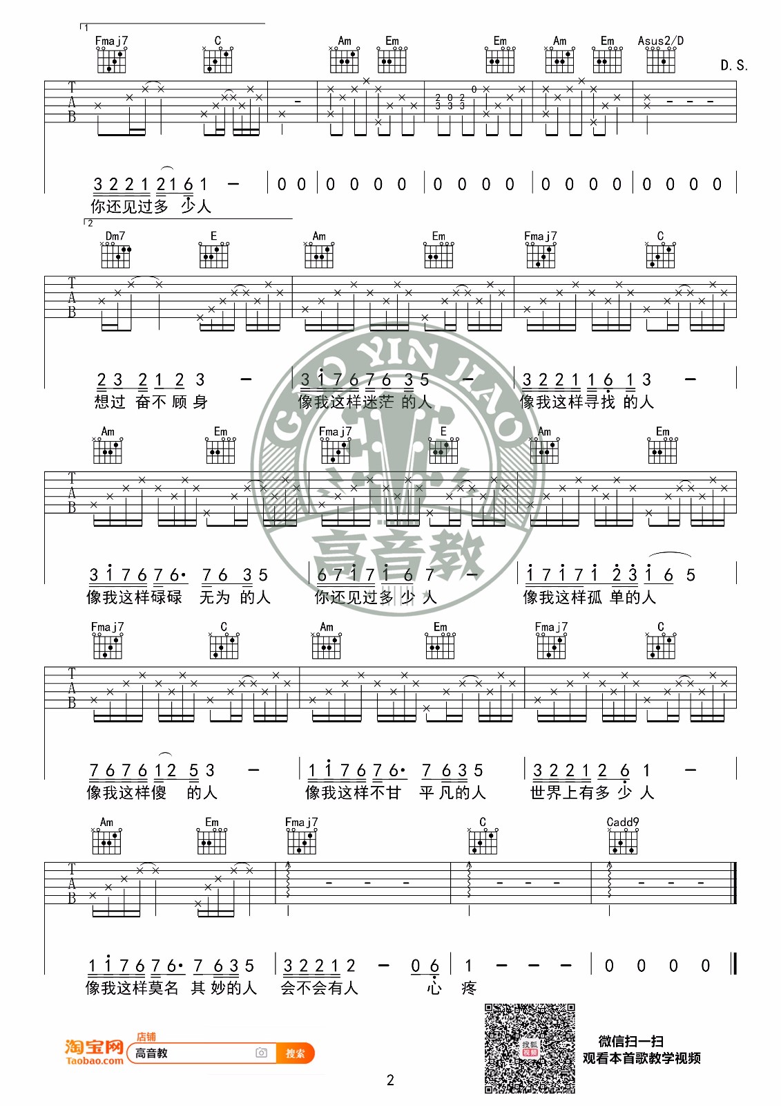 《《像我这样的人》吉他谱_毛不易_C调标准版六线谱_高音教吉他弹唱教学分享,听到这个歌曲曲,是不是都想起了自己被强大外表包裹的小脆弱的内心?毛不易唱的就是这样平凡的你我,又是浅浅的语调,唱着深刻的生活。本次带来由高音教团队出品的曲谱及教学,原调为#C调,这里采用C调指法编配,变调夹夹1品,拍速为64bpm。
