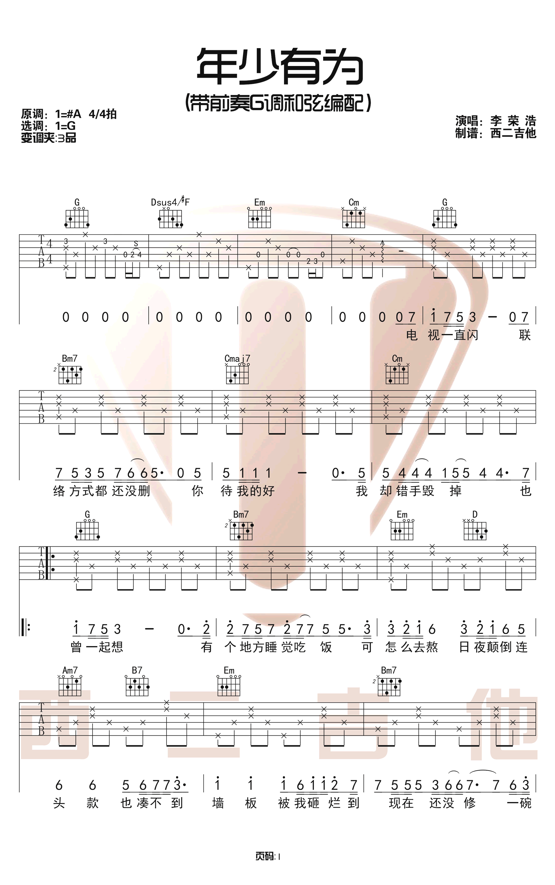 《李荣浩《年少有为》G调简单版吉他弹唱谱_高清图片谱分享,此次带来由西二吉他编配并制谱的李荣浩《年少有为》吉他谱,这个歌曲原调为#A调,选调采用G调指法编配,除了Bm7及Cm6和弦之外,其他都没有难度,另外后面的扫弦节奏型可以自己发挥,分享及扫弦都行。