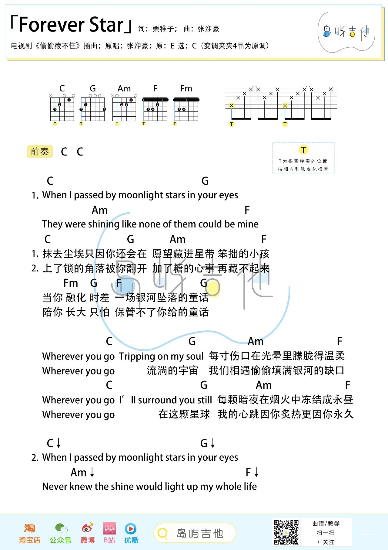 Forever Star吉他谱,它是偷偷藏不住插曲演唱的原版歌曲吉他演奏非常灵活,节奏感很强。,由岛屿吉他制谱,是一首经典简单的吉他谱,适合新手学习和弦指弹的C调编配曲谱,弹唱时可,原调版弹本次教学采用C调,是非常好听的弹唱曲谱,下面完整版高清六线谱由吉它谱大全为大家更新分享。有喜欢吉它的朋友欢迎关注!