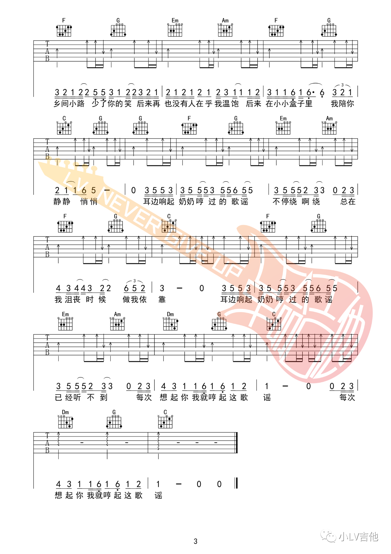 奶奶的歌谣吉他谱,它是革命吉他教室演唱的原版歌曲它的旋律非常易于让人沉浸其中.,由小LV吉他制谱,是一首经典简单的吉他谱,适合新手学习和弦指弹的C调编配曲谱,弹唱时可,原调版弹本次教学采用C调,是非常好听的弹唱曲谱,下面完整版高清六线谱由吉它谱大全为大家更新分享。有喜欢吉它的朋友欢迎关注!