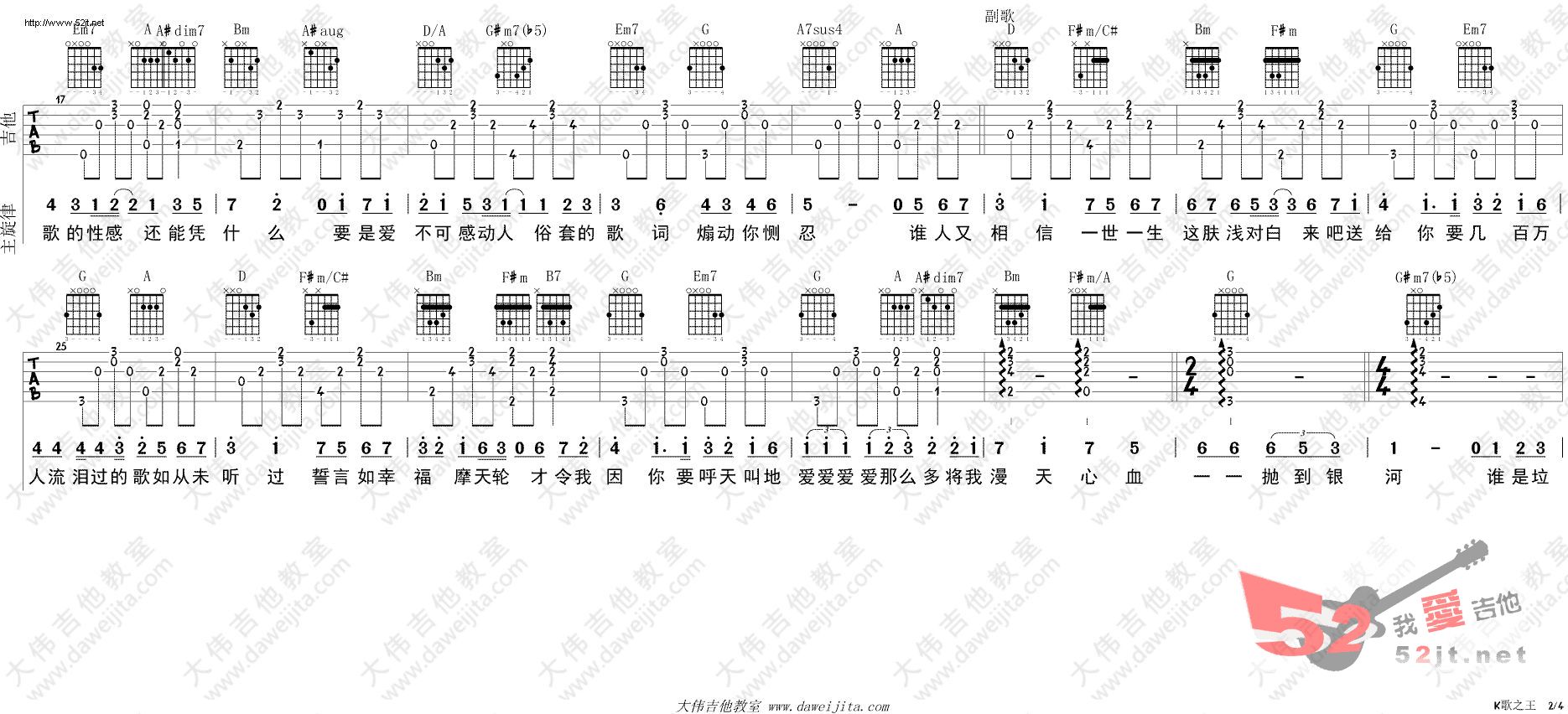 《K歌之王》吉他谱,由陈奕迅演唱的,流行弹唱版吉他谱视频,K歌之王六线谱,C调制法,一共4张高清弹唱图片谱,采用'4/4拍子,拍速为60-80,单吉他,弹奏难度为:简单,吉他部落 jita2012.com整理上传。K歌之王 吉他简谱K歌之王 歌词我唱得不够动人你别皱眉我愿意和你约定至死我只想嬉戏唱游到下世纪请你别嫌我将这煽情奉献给你还能凭甚么拥抱若未能令你兴奋便宜地唱出 写
