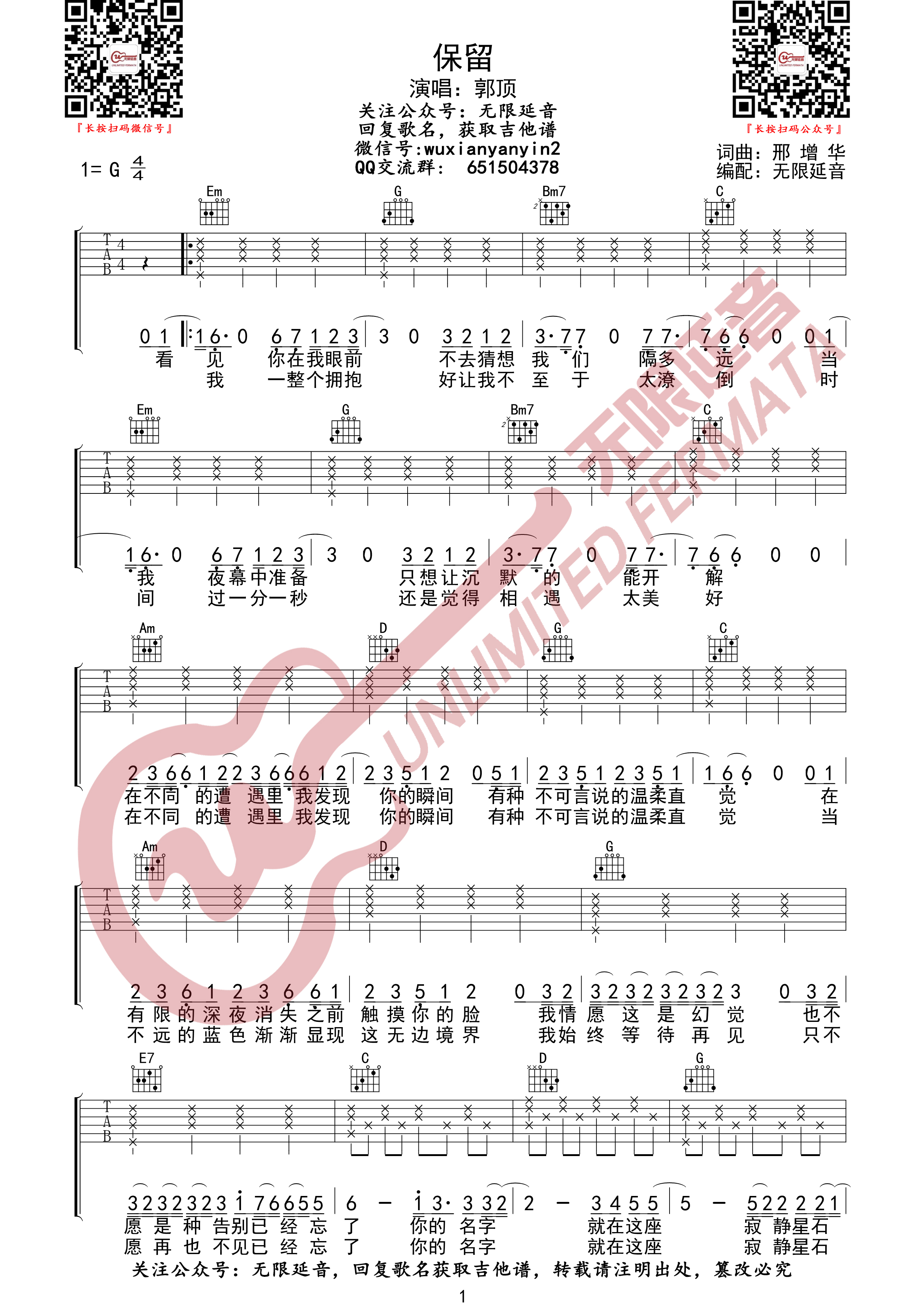 以上就是G调版的保留吉他谱_郭顶_G调高清完整版吉他谱 ,如果正是您所寻找的六线高清图片谱,希望能收藏本站,这里会源源不断更新各种郭顶合集的曲谱。如果你已经掌握了一定的弹奏技巧,那么扫弦、指弹、和弦、指法等更高级的技巧也能在吉它谱网站中找到对应的教程和独奏谱子